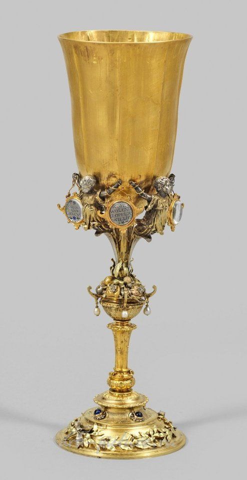 Желтое золото и серебро с позолотой. Изогнутое, ступенчато поднимающееся круглое основание с нанесенной рельефно-пластиковой гирляндой из филигранных оливковых веток, заканчивающейся бантом. Над ним - четыре сапфировых кабошона в оправе. Узкий стержень у основания с вдавленным узлом, окруженный перламутровыми фризами и изящными годронами, по центру обработан полностью пластифицированным узлом в виде пышно наполненной, натуралистически оформленной корзины с фруктами, снаружи украшенной четырьмя маленькими жемчужинами. Над ним - высокая чашечка, похожая на цветочную чашечку, сочлененная изящными вертикальными выступами с зазубринами и рельефными структурами, выполненная из золота, поддерживаемая четырьмя крупными спиралями, расположенными в ряд, с приподнятыми концами. В руках, подвешенные на тонких шнурках, четыре пассивно изогнутых медальона, частично украшенных стеклянными кабошонами. Внутри них надписи "ЗАБОТЛИВЫЙ И ЛЮБЯЩИЙ", "БЛАГОНАМЕРЕННЫЙ И ГОТОВЫЙ К САМОПОЖЕРТВОВАНИЮ", "БЛАГОЧЕСТИВЫЙ И МИЛОСЕРДНЫЙ". Один медальон заменен. Датировано 585, 800, клеймо изготовителя. Вес около 480 г. Высота 24,5 см. Этот роскошный и в то же время чрезвычайно изящный кубок известного придворного ювелира, работающего с 1840 года, завораживает своей детализированной и мастерски выполненной кузнечной работой, а также сочетанием различных материалов и конструкций и, таким образом, полностью соответствует традициям мюнхенского историзма. Среди наиболее выдающихся ювелиров этого времени - не только Теодор Хайден, но и Антон Вайсхаупт или Эдуард Волленвебер. См. Hase, Schmuck в Deutschland und Österreich, стр. 209; Mundt, Historismus, стр. 326, 360. Превосходный и великолепный серебряный кубок в стиле немецкого историзма с куполом из 14-каратного золота, жемчугом, сапфировыми кабошонами и путти, содержащий четыре медальона с надписями работы мюнхенского придворного мастера по золоту и серебру Теодора Хайдена (работает с 1840 года). Один медальон заменен. Стандартные марки 585 и 800. Клеймо изготовителя. Мюнхен. Королевский баварский придворный ювелир Теодор Хайден. Около 1900 года.
