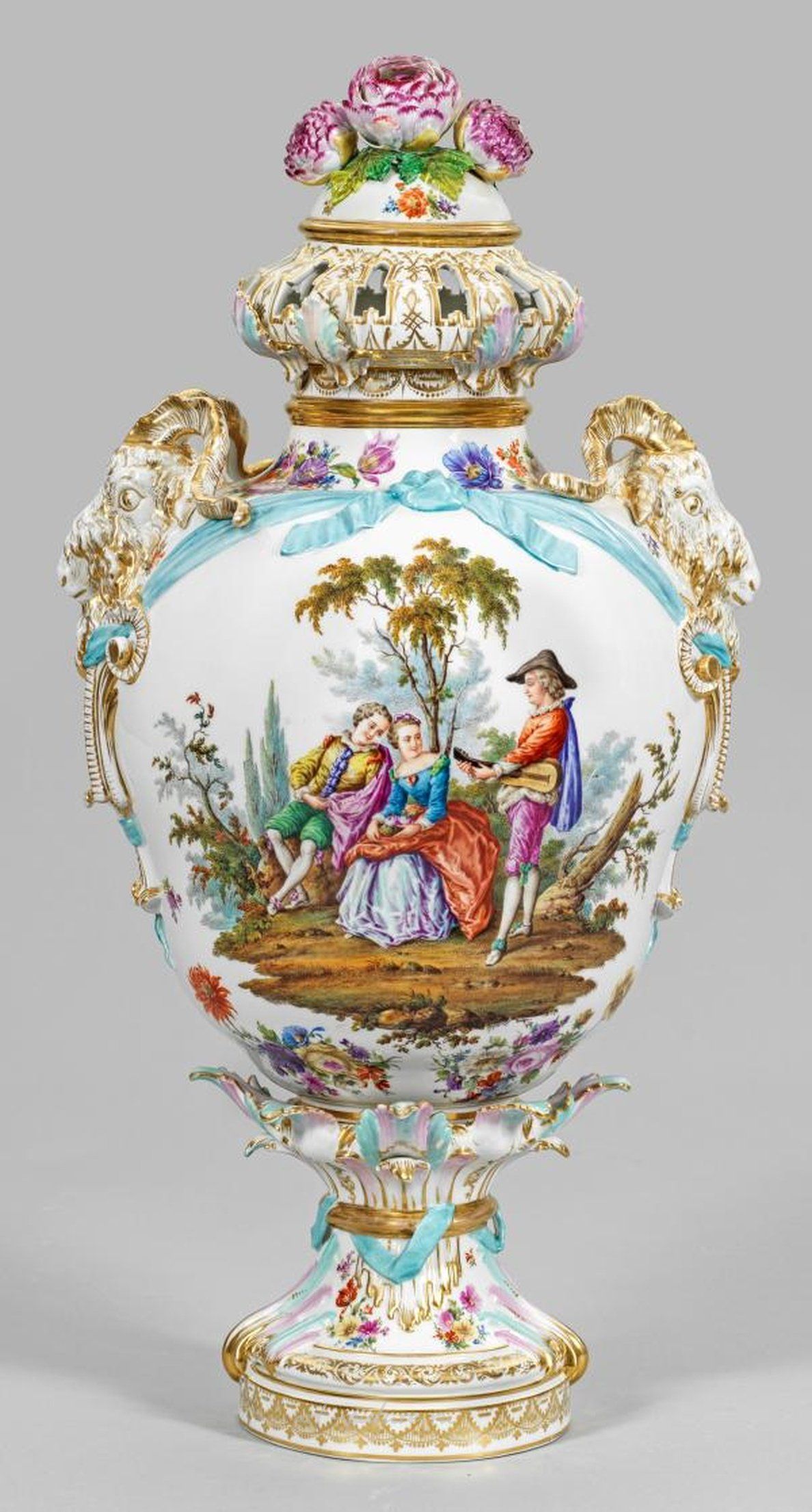 Ваза для подбора смеси ароматов, поднятая на высокой круглой ножке, с центральной светлой вытянутой частью в виде корпуса, окруженной светло-голубой рельефной декоративной полосой. На боковинах есть большие, изваянные головы баранов. Прорезная крышка искусно выполнена с центральной розочкой в качестве ручки. С обеих сторон есть живописное изображение рококо общества в парковом ландшафте, выполненное по мотивам работ Жан-Антуана Ватто, окруженного яркими цветочными композициями. Полихромное живопись. Всю поверхность украшают орнаментальные золотые края и богатая золотая детальная отделка. Частично восстановлено; незначительные повреждения; клеймо скипетра. Высота: 64 см. См. Ponert, Каталог Берлинского Музея, Фиг. 134. Большая ваза для подбора смеси ароматов с головами баранов, сценой Ватто и цветочным декором. Частично восстановлено. Незначительные сколы. Клеймо скипетра KPM-Berlin. Около 1820-1830 годов.