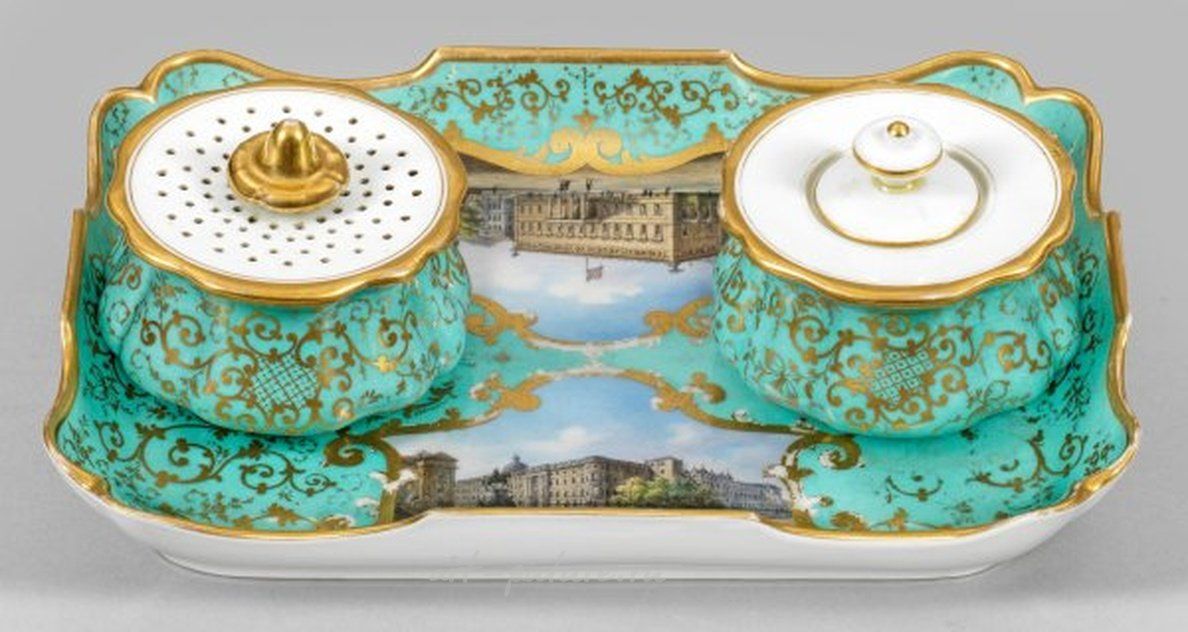 Трёхчастное чернильное перо, песочница на планшете. Круглой или прямоугольной формы, изящно изогнутая. Бирюзовый фон. Окружающие декоративные золотые края с кайюте, полосой и мозаичными узорами. В углубленном зеркале, оформленное в золотой рамке картуши, изображающие виды дворца Кайзера Вильгельма под липами в Берлине, с поднятым королевским флагом и конно-всаднической статуей Фридриха Великого (также известного как "Старый Палац") или "Королевский Палац и длинный мост в Берлине" по картинам Карла Даниэля Фрайданка в изысканном полихромном исполнении. Золотые акценты. Скипетр и марка художника. Высота сосуда: 7 см. Планшет: 25 см х 18 см. Бирюзовый фон и золотые декорации пишущего набора с тонко нарисованными видами дворца Кайзера Вильгельма ("Старый Палац") и Королевского Берлинского городского дворца по К.Д. Фрайданку. Золото изношено. Скипетр и марка художника. КПМ-Берлин. Вторая половина 19 века.