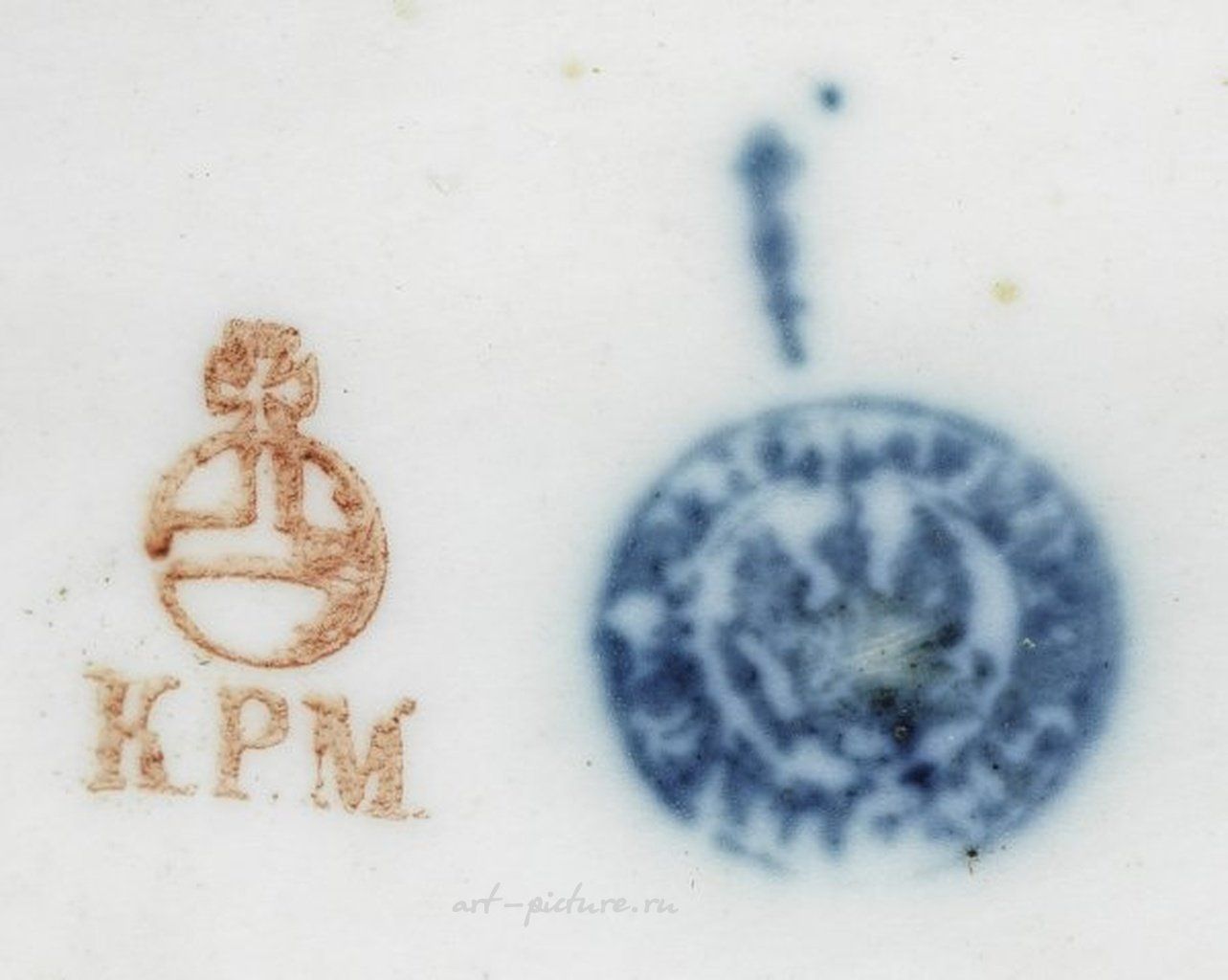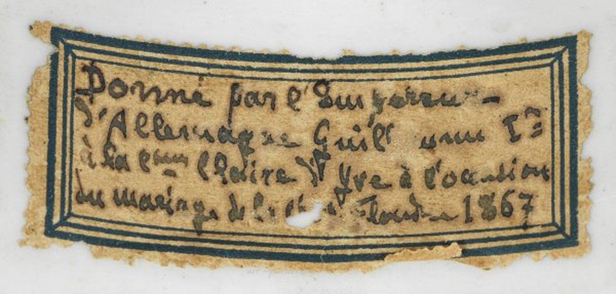 Фарфоровая бисквитная ваза, частично глазурованная. Фигурная, квадратная основа с узором из золотистой вермишели. На прямоугольном постаменте расположена поднятая, фигурная круглая ножка, яйцевидное тело с цилиндрической шеей и изогнутым, фигурным краем. Два противоположных изогнутых ручки в форме "S" с мотивами листьев аканта. Верхняя часть вазы выполнена из синего матового фарфора с золотистыми вкраплениями. На передней стороне позолоченный медальон, увенчанный королевской короной Пруссии, с портретом Вильгельма I Прусского в качестве короля Пруссии в форменной одежде, украшенной рядом высоких прусских орденов и наград, включая орден "Pour-le-Mérite" и ленту и звезду ордена Черного Орла. Многоцветная роспись. Богатое позолочивание с золотыми лучами. Ножка и шея вазы украшены венком из дубовых листьев. Модель 1606 "Ваза с украшенной ручкой". На дне вазы находится старая бумажная этикетка на французском языке с надписью "Вручена императором Вильгельмом I графине Клер д'Иве по случаю свадьбы графа и графини Фландрии 1867 года" (приложенная после императорской коронации). На основании находится монограмма в старой германской графике. Маркировка: скипетр и монетная марка, а также клейма художника. Высота вазы 48 см. Высота основания 8,5 см. 22,5 см x 22,5 см. Это придворный подарок от будущего кайзера Вильгельма I Прусского по случаю свадьбы принца Филиппа Бельгии (1837-1905), так называемого графа Фландрии и третьего сына Леопольда I, короля Бельгии, с Марией Луизой Александрой Каролиной Гогенцоллерн-Зигмарингенской (1845-1912) в католическом соборе святой Екатерины в Берлине. Этот брак был устроен королевой Викторией Англии. Таким образом, Мария Луиза, дочь принцессы Йозефины Баденской и принца Карла Антона Гогенцоллерн-Зигмарингенского, стала графиней Фландрии. Согласно надписи, эта ваза была подарена графине Клер д'Иве, которая была придворной дамой Марии Луизы Гогенцоллерн-Зигмарингенской. Такие великолепные вазы с портретом короля дарились от имени Вильгельма I Прусского по случаю важных событий или в знак благодарности в качестве личных подарков. В момент подарка этой великолепной вазы в 1867 году Вильгельм I был еще королем Пруссии, пока в 1871 году он не был венчан немецким императором. См. Ponert: Catalogue Berlin Museum, Applied Arts I/Ceramics, фиг. 126 (форма), 130 (великолепная ваза с портретом Вильгельма I в качестве императора); Коллекция Стадтмузеум Берлина, K G K 68/19. Происхождение: из собственности позднего кайзера Вильгельма I Прусского для свадьбы графа и графини Фландрии с графиней Клер д'Иве; от потомков семьи. Великолепная королевская ваза из матового полуночно-синего фарфора с портретом Вильгельма I в качестве придворного подарка по случаю свадьбы графа Филиппа Фландрии с принцессой Марией Гогенцоллерн-Зигмарингенской в 1867 году в Берлине. Маркировка: скипетр, монета и клейма художника. КPM-Берлин. Приблизительно 1867 год.