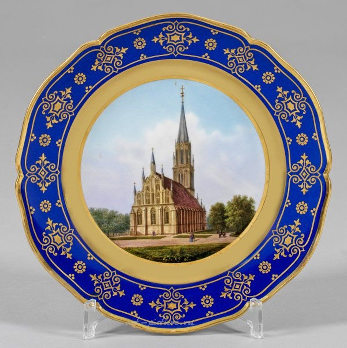Круглая форма KPM-Berlin с изогнутым краем. В зеркальной медальоне золотая рама с изображением церкви Святой Марии в Нойбранденбурге. Исключительно тонкая, полихромная роспись. Переход к флагу с позолоченным бортом. Флаг с золотистым орнаментом, излучающимся на фоне королевского синего цвета. Внизу есть надписи в черном цвете: Zepter, Pfennig и марка художника. Диаметр 25 см. Топографическая фарфоровая тарелка с очень тонко нарисованным изображением церкви Святой Марии в Нойбранденбурге. Знаки Zepter, Pfennig и художника. KPM-Berlin. Около 1849-1870 гг.