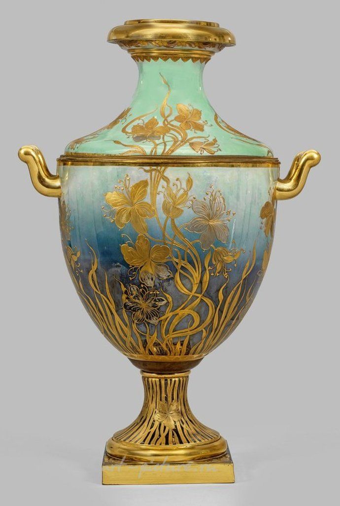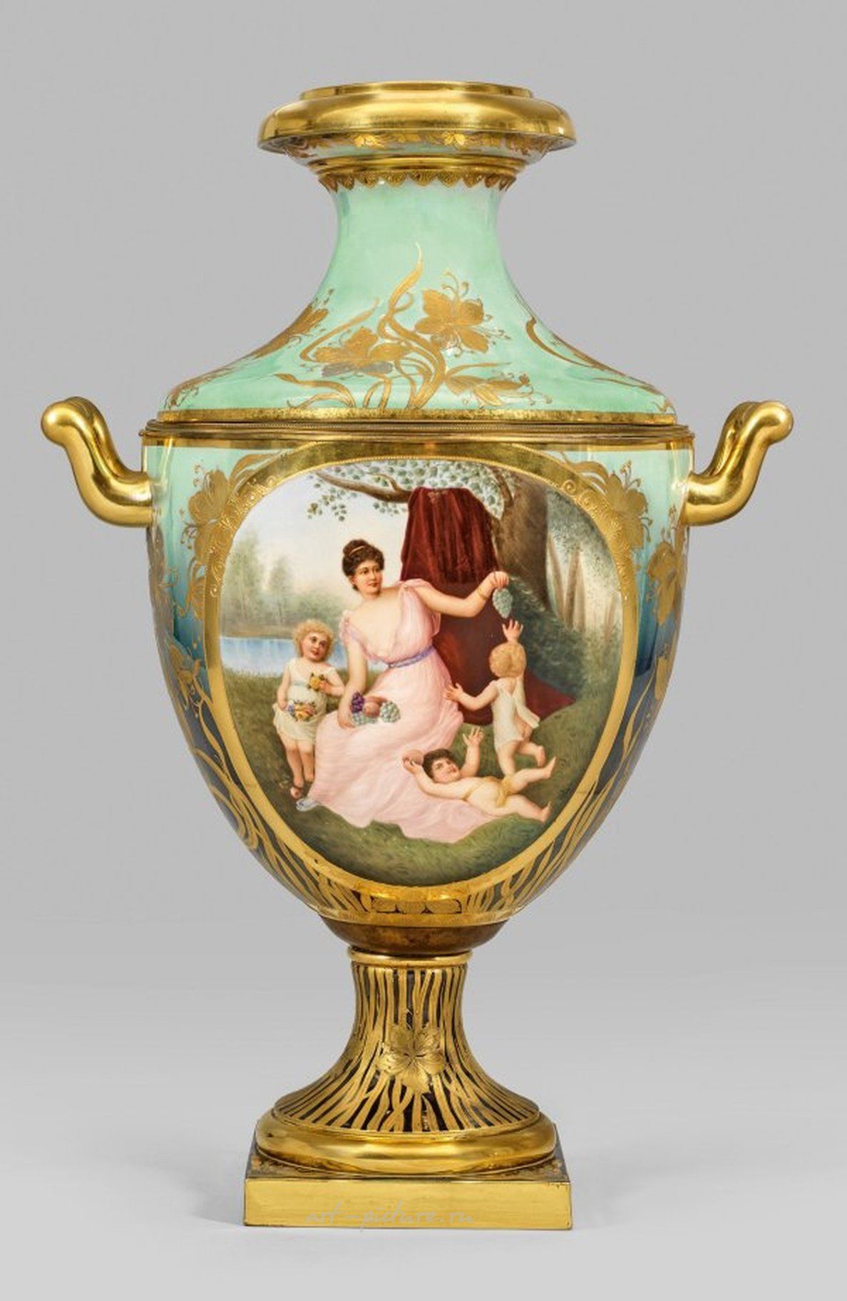 Форма KPM-Berlin, так называемая Мюнхенская ваза. Над квадратными пьедесталами и вогнутым круглым основанием корпус овальной формы с поднятым плечом, сужающейся шейкой с выступающим, профилированным ребром рта. Боковые высокие, профилированные ручки. На стене большой стилизованный рельефный золотистый декор в стиле юджендстиль в масштабе на поверхности, переходящей от цвета халедоновой зелени к колбальтово-синему. На видимой стороне имеется резерв в золотой контур со изображением молодой женщины, сидящей на берегу с тремя детьми, в летнем пейзаже. Изумительная полихромная живопись и богатая рельефная золотая декорация. Подпись "Вагнер". Внизу имеется маркировка "Abundantia". Марка скипетр и марка пчеловодного декоратора. Высота 77 см. Модель "Мюнхенская ваза" чаще всего преподносилась в дар дружественным княжеским домам от имени королевского дома Пруссии и производится в четырех разных размерах с 1829 года. Например, в 1832/33 году император России получил несколько "Мюнхенских ваз". См. Понерт, Кат. Берлинский музей, Прикладное искусство I, Керамика, рис. 118, с. 126; Коллман/Ярхов, Берлинский фарфор, Том I, с. 82 и далее. Большая величественная вена-стиле ваза КПМ Берлин "Мюнхен" с изображением женщины с тремя детьми, сидящей на берегу озера. Халедоново-зеленый до колбальтово-синего фон и поднятая золотая декорация. Марка скипетр и марка пчеловодного декоратора. КПМ-Берлин. Конец XIX века/начало XX века.