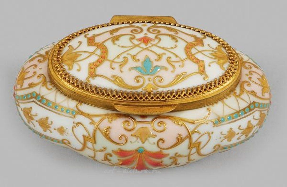 Четырехместный, тисненый корпус с овальной, слегка изогнутой клапанной крышкой. Все стороны украшены богатым декором из тонкой рельефной золотой виноградной орнаментики с различными по цвету таящими эмалевыми жемчужинами и цветами, так называемым драгоценным фарфором, а также вставками пастельных тонов фона в нежно-розовых, зеленых и бежевых тонах. Полихромная глазурь и эмальная роспись. Позолоченная монтаж с открытым нажимным элементом и окружающей границей в виде трехгранной стрелы. Марка скипетра. Высота 3,5 см. 7 см х 4,5 см. См. каталог Музея Брёхана, том V/I, № 93ff. Редкий небольшой шкатулка в стиле модерн с богатым флористическим эмалевым декором. Марка скипетра. KPM-Берлин. Около 1900 года.