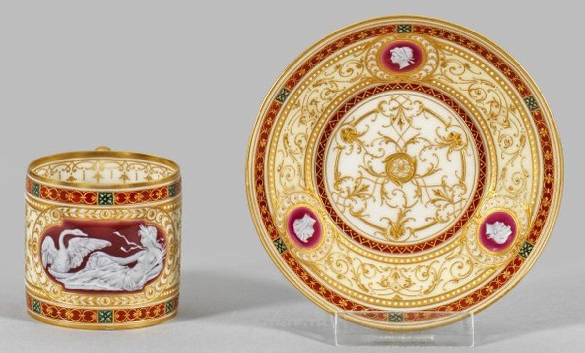 Цилиндрическое тело с закругленными, золочеными ушками. На ручке, в зеркале и на поднимающемся флаге богатое, тонко проработанное золотое покрытие со вихревыми арабесками и орнаментальными границами на светло-желтом, железно-красном и мрачно-зеленом фоне. В резерве, орнаментально оформленные овальные резервы и медальоны с античными изображениями в белой росписи "пате-сюр-пате" на винно-красном и малиновом фоне. На отображаемой стороне - изображение расположенной по наклону Леды, сопровождаемой лебедем, между овальными мотивами пути. На флаге изображены женские головы в стиле античности. Золотая орнаментальная граница и соответствующие рельефные золотые орнаменты на внешней стенке блюдца. Марки художника золотом. Скипетр и марка художника. Высота 4,5 см. Очень великолепная чашка для мокко с рельефным, золотистым декором в классическом стиле "пате-сюр-пате". Золотая подпись художника. Скипетр и марка художника. KPM-Berlin. Около 1900 года.