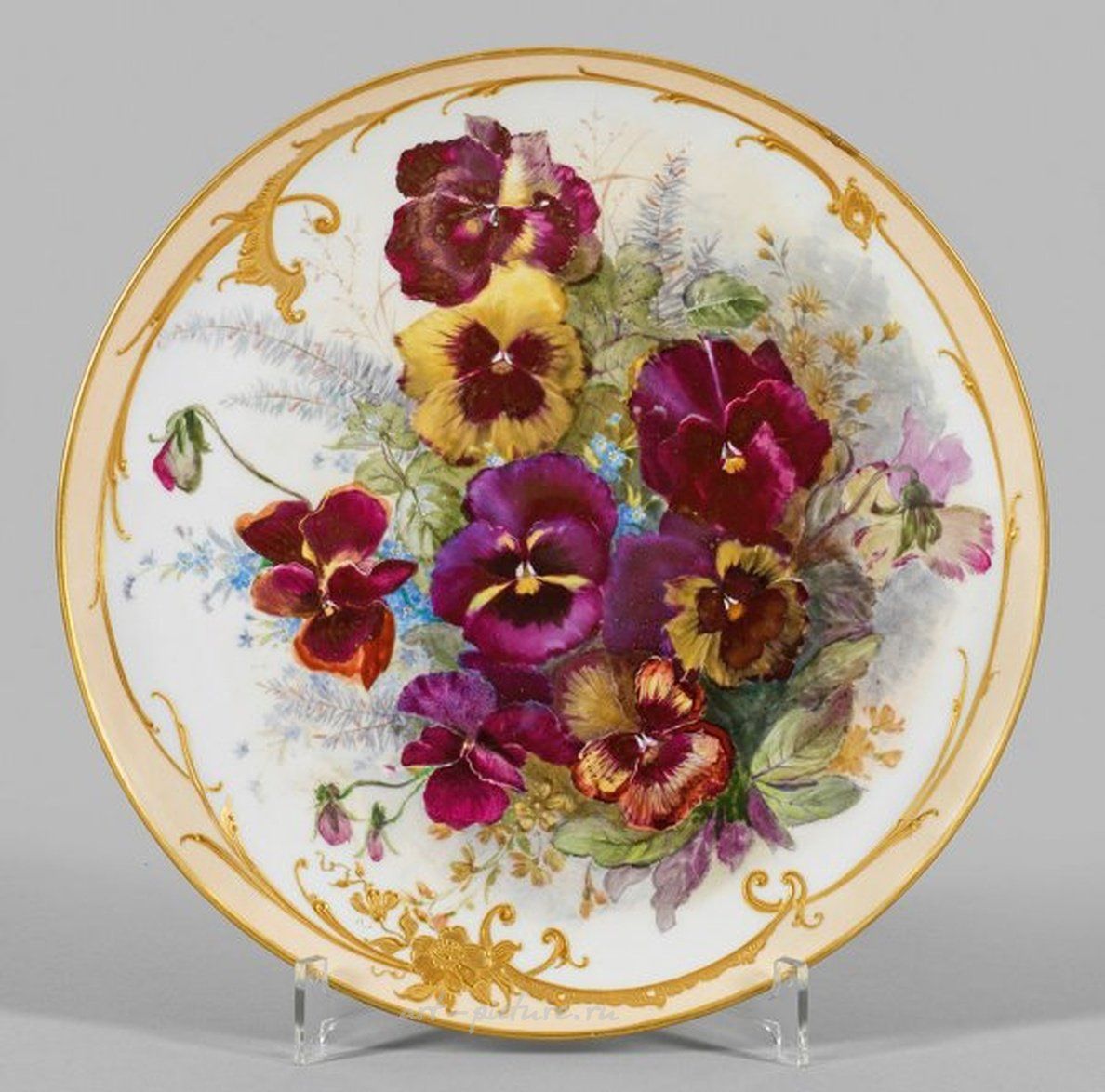 Круглая, плоская, столовая форма с гладким краем. В зеркале большая композиция из разноцветных анютиных глазок, выполненных в импрессионистском стиле, придающих ему очаровательный вид. Картина выполнена яркими, полихромными, мягкими мазками кисти. Шамурово-цветный фон оформлен изящными рельефными золотыми бордюрами и цветами. На задней стороне подпись художника "Клоз" (?) с датой 1895 года. Отверстия для крепления на стену. Скипетр и марка художника. Диаметр: 30 см. Настенная тарелка тонко расписанная в декоре анютиных глазок. Подпись художника с датой 1895 года. Скипетр и марка художника. KPM Berlin. Приблизительно 1895 год.