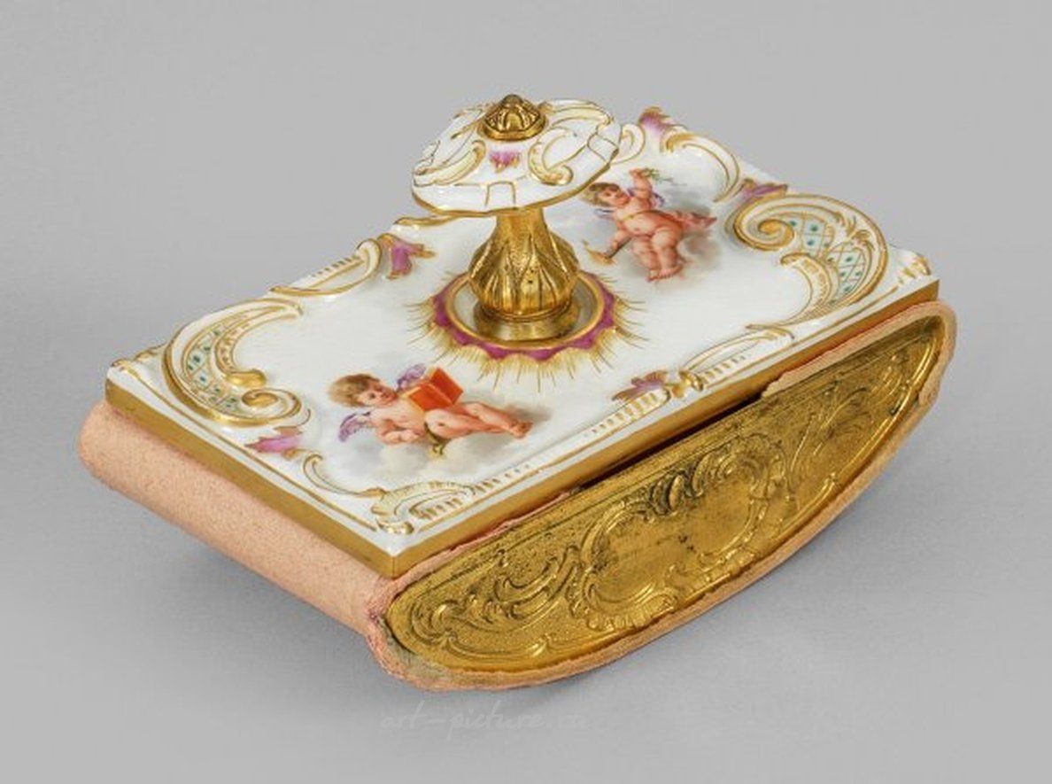 Из женского набора для письма. Фарфор, золоченый бронза и картон. Прямоугольная фарфоровая тарелка с балюстровидной ручкой над округлым основанием с рококо-украшением. Рельеф в стиле рококо и декор с купидонами. Полихромная живопись с обильными золотыми деталями. Возможно, изготовлено в мастерской KPM. Высота 7,5 см. 12 см x 7 см. Сравните с Dietz, Sabet Collection, стр. 421 и далее. Нео-рококо. Золоченая бронза и фарфорный подставка для стирания, окрашенная с изображениями купидонов. KPM Берлин. Около 1900 года.