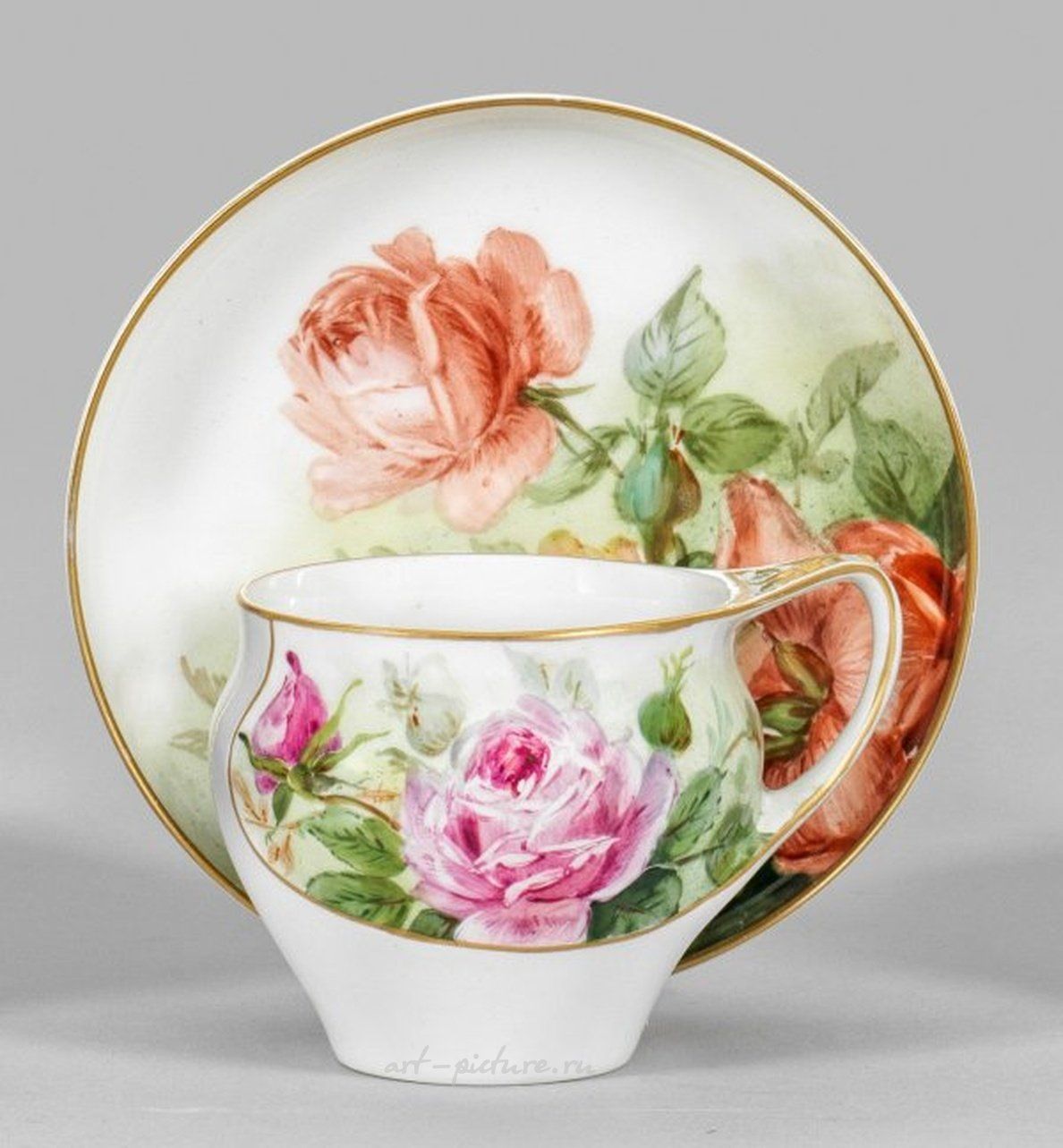 Легко изогнутое, круглое тело, боковые полосы прорисованы, надломленная через рабочую рукоятку с растительным рельефом. С обоих сторон стены цветочный мотив розы в мягкой полихромной живописи на бледно-зеленом фоне (позднее). Золотая окантовка. Соответствующая розовая декорация в зеркале блюдца. Разработано Паулем Шлей, 1901 год. Монограмма художника "G.W.". Знак скипетра. Высота 7 см. См. И. в. Тресков, № Abb. 35, рис. 1; стр. 290, № 6553. Начало 20 века. Фарфоровая чашка и блюдце в стиле Арт-нуво раннего 20 века, окрашенные цветочным декором. Монограмма художника "G.W."; Знак скипетра KPM-Берлин. Начало 20 века.