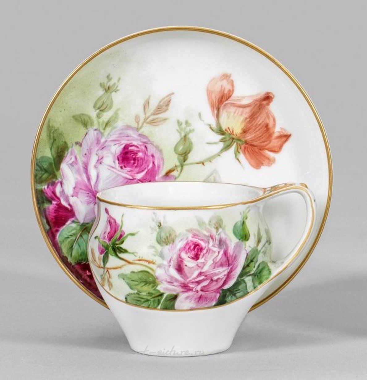 Слегка изогнутое, круглое тело, боковая лента, над которой находится розовый рельефный ручка. С обеих сторон на стене яркий розовый орнамент в мягкой, полихромной живописи на зеленом фоне (поздний). Золотая окантовка. Соответствующий розовый узор на зеркале блюдца. Разработано Полом Шлеем в 1901 году. Монограмма художника "G.W.". Марка скипетра. Высота 7 см. См. И. ван Тресков, № Рис. 35, Фиг. 1; с. 290, № 6553. Ранняя товар марка начала 20-го века Art Nouveau чашка и блюдце, расписанные цветочным орнаментом. Монограмма художника "G.W."; марка скипетра КПМ-Берлин. Начало 20-го века.