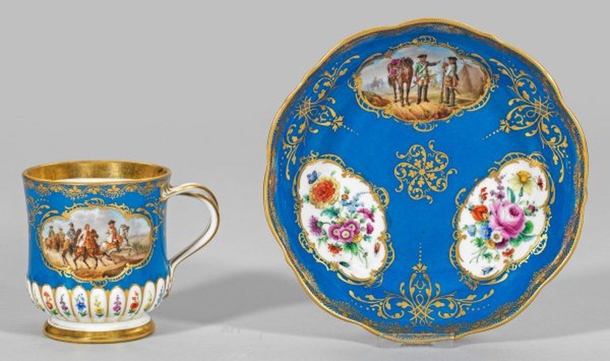 На поддоне есть выпуклая, округлая опорная ножка, а под ней тело с узором говарона. Листья отклонены в сторону. С обеих сторон стены и в зеркале есть четырехпроходные резервы с синим фоном и позолоченными краями. Внутри изображены боевые сцены с солдатами на конях или солдатами в полевом лагере, а также красочные цветочные композиции. Говардоны украшены цветными ветвями цветов. Полихромная роспись. Богатая золотая отделка листьев, ленты, розетки и золотые кружевные края. Марка с мечом. Высота чашки 9,5 см. Диаметр тарелки 18 см. См. Jedding, Фарфор Мейсен XIX/XX века, с. 82 и далее, № 81 и далее. Большая фарфоровая чашка середины XIX века с тарелкой, красиво расписанная боевыми сценами и цветочным узором. Марка перекрещенных мечей. Мейсен. Середина XIX века.