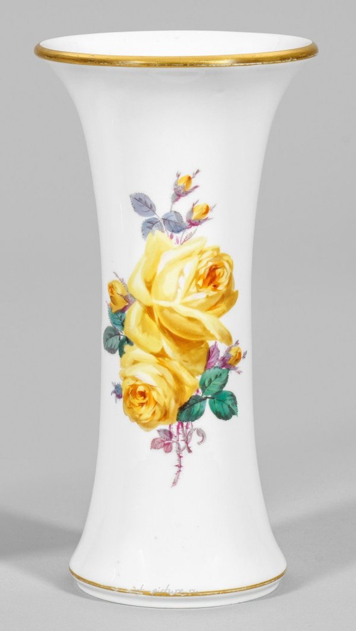 Тело в форме флейты. С обеих сторон стены – букет из желтых роз в нежном, полихромном стиле росписи. Золотая окантовка. Меч-марка. Высота 24 см. Фарфоровая ваза с розовым декором, раннего 20 века. Марка перекрещенных мечей. Мейсен. Начало 20 века.
