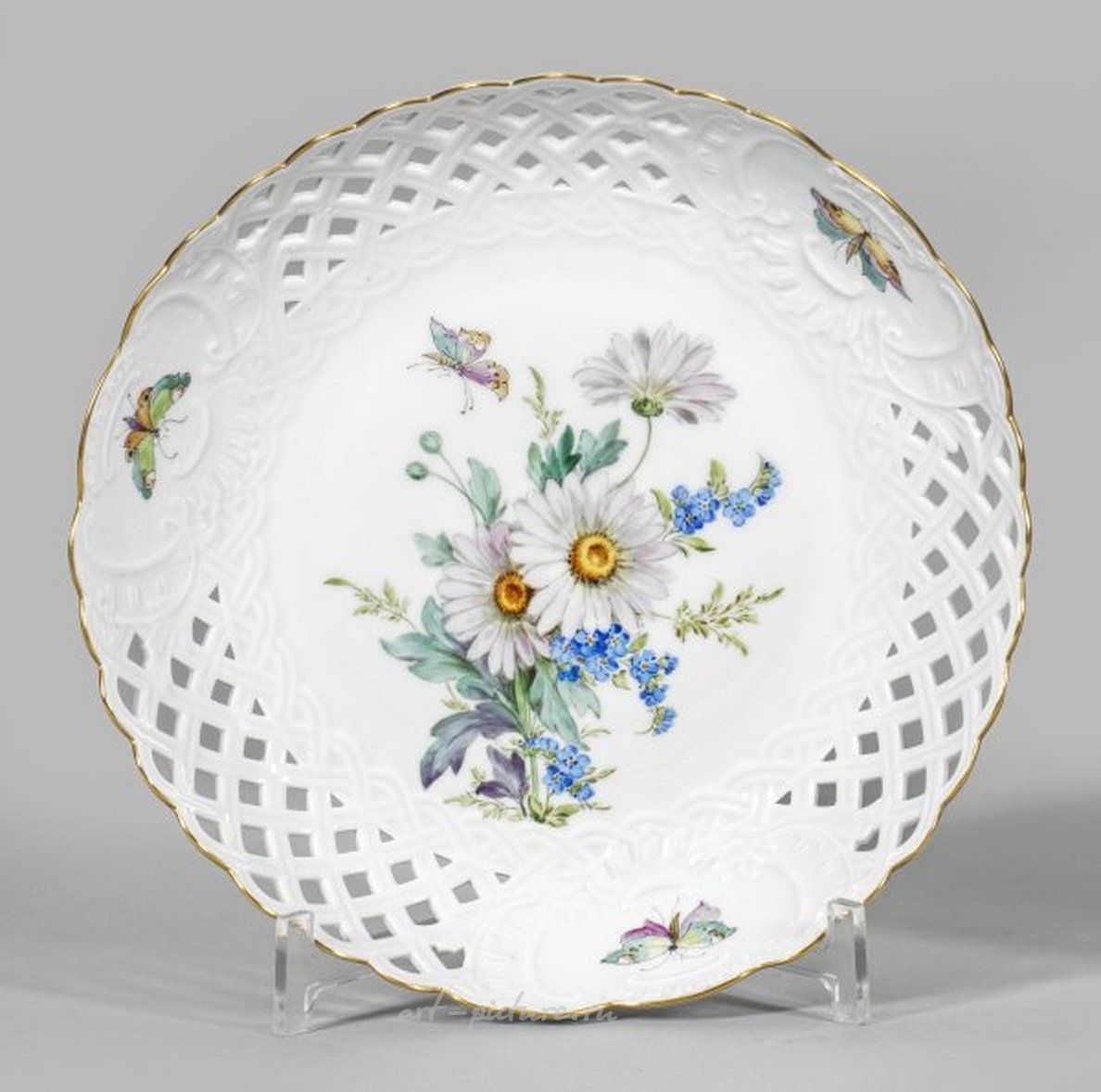 Круглая форма. Сплетено в корзине подобной манере, на стенном панеле имеются чередующиеся рельефно украшенные картуши рокаля, внутри которых изображены яркие бабочки. В зеркале изящно расположено цветочное убранство из астров и незабудок, окрашенных в многоцветные тона. Изделие украшено золотой каймой и имеет марку в виде перекрещенных мечей. Его диаметр составляет 24,5 см. Эта фарфоровая пирожная миска, изящно украшенная цветочным декором, была произведена Мейсеном после 1973 года.