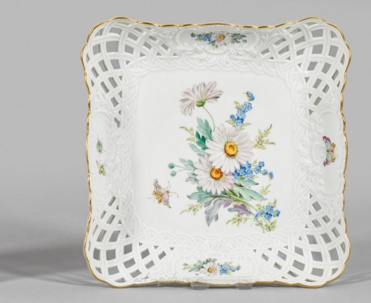 Ангулярная форма. Корзинообразно плетеная, стенная панель наполнена рельефными карточками в рокайльном стиле, с изображением ярких бабочек и небольших букетов. В зеркале изящно расположен цветочный аромат из астров и незабудок, окрашенный мелкими полихромными красками. Изделие украшено золотой окантовкой и имеет клеймо пересеченных мечей. Размер составляет 24,5 см х 24,5 см. Эта фарфоровая чашка для пирожных изыскано окрашена цветочным мотивом. На ней имеется клеймо пересеченных мечей фарфоровой фабрики Мейсен. Создана в середине XX века.