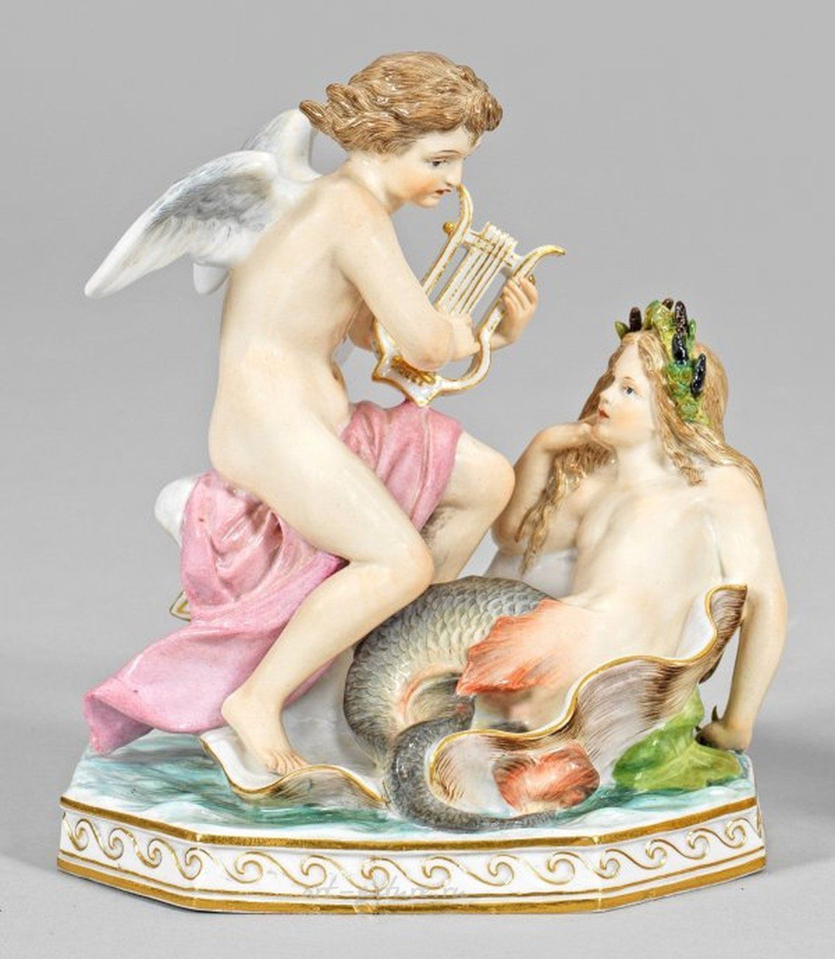Восьмиугольный пьедестал с рельефной волновой полосой. Над волнами дворецкую форму может рассматривать Нереидой с рыбьим хвостом и сидящим перед ней Купидоном, слушающим ее. Боковое висячее лук и наполненный колчан Купидона. Полихромная живопись с золотыми деталями. Возможно, авторство Отто Кёнига, около 1863-1866 года. Модельный номер G 148. Трещины от выгрева. Незначительные сколы и реставрации. Маркировка в форме меча. Высота 16 см. После обучения в художественной школе Майсенской мануфактуры Отто Кёниг изучал в Дрезденской художественной академии с 1860 года, под руководством Эрнста Хеньеля с 1861 года. В 1868 году он был назначен профессором в Венской школе прикладного искусства. См. Джеддинг, стр. 152. Фигурная группа из фарфора "Купидон и Нереида". Трещины от выгрева. Незначительные сколы и реставрации. Маркировка перекрещенных мечей. Майсен. Конец 19 века.