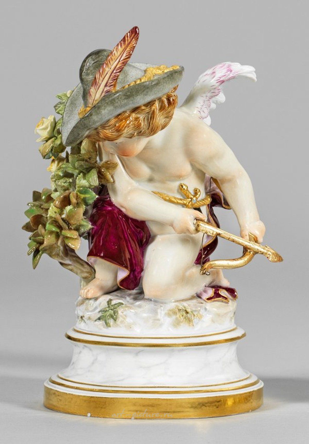 На профильном, мраморном круглом пьедестале крадется присевший Амур за кустом роз, украшенный пернатой шляпой, держа в руках лук и стрелу. Полихромное живопись с золотыми элементами. Возможно, выполнено Хайнрихом Швабе. Модельный номер L 106. Восстановлено. Марка меча. Высота 16 см. Фарфоровая фигурка Амура с луком и стрелой. Мейсен, около 1900 года.