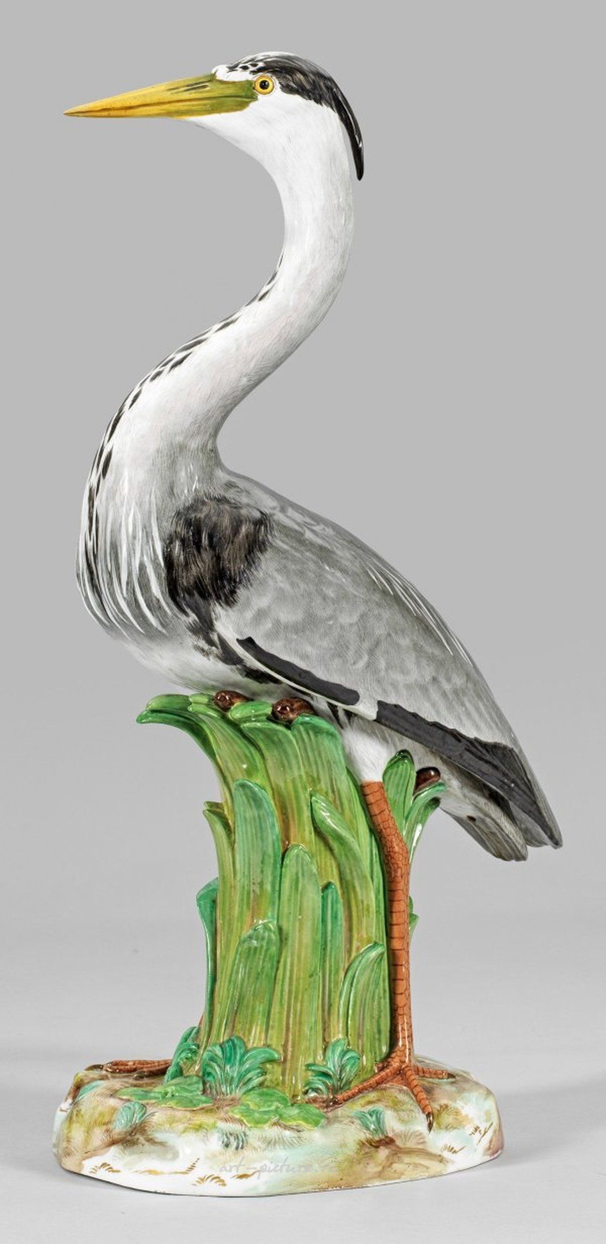 На пьедестале в природной тематике, с рельефными листьями кувшинки, окруженной высокими тростниками, стоит величественная цапля (или серая цапля) с длинными ногами-колонами. Оперенность легко украшена рельефом, а на оперении и деталях глаз и головы изображено натуралистичным образом. Полихромная живопись выделена золотом. Возможно, автор - Эрнст Август Лойтериц, около 1850 года. Модельный номер З 57. Тонкая трещина. Меч-марка. Высота 57 см. Лойтериц, который получил образование у Эрнста Ришеля в Дрезденской академии изящных искусств, работал на Мейсенской мануфактуре с 1843 по 1886 год. Он создал множество фигур и фигурных групп, а также модельные проекты по мотивам Йоханна Иоахима Кендлера, оставаясь верным оригинальным композициям. Среди его животных скульптур он создал так называемого «Падуанского петуха» (около 1855 года) и «Козу с малышами» (около 1853/55 года), а также оригинальную фигуру евразийской поганки. Большая фарфоровая фигура цапли, созданная Э.А. Лойтерицем в начале XX века. Тонкая трещина. Незначительный реставрированный. Перекрещенные мечи на марке. Мейсен. Вторая половина XIX века.