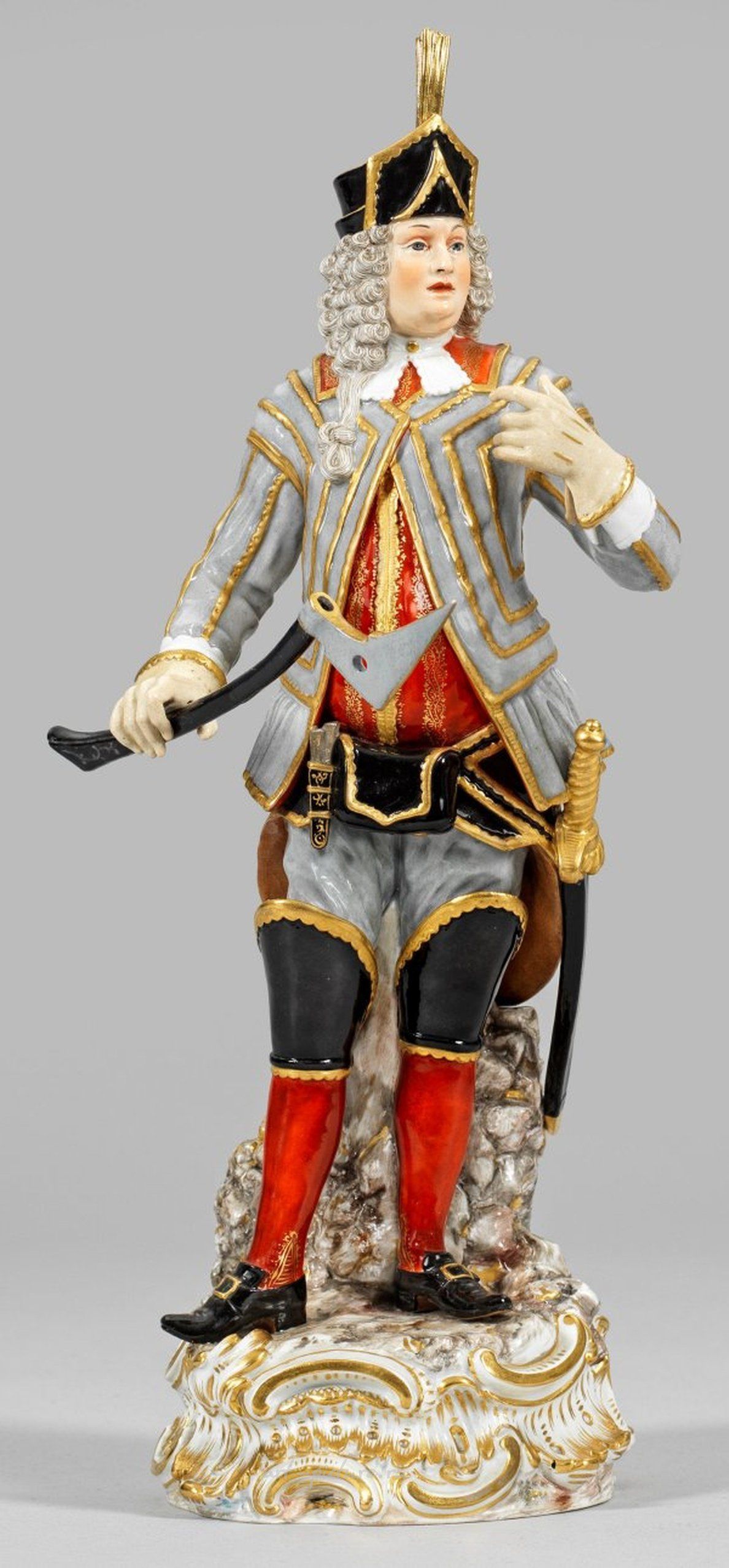 Высокий, ярко выделенный Рокаильский пьедестал. Стоит на скалистой местности, горнорабочий украшен золотым парадным костюмом. Его правая рука поднята, в левой он держит бороду. Волосы покрыты париком с порошком и черной горняцкой шляпой. Вокруг его талии пояс, поясная сумка и меч. Полихромная живопись с золотыми деталями. Возможно, выполнена Паулем Хельмигом в 1896 году. Модельный номер P 188. Некоторое неизвестное восстановление; отметка меча. Высота 33,5 см. Пауль Хельмиг создал серию горнорабочих и групп, вдохновляясь горнорабочими моделями Иоганна Йоахима Кендлера из 18 века. См. Слотте, Каталог фарфора и стекла в Немецком горнодобывающем музее Бохума, номер 32. Фарфоровая фигурка горнодобывающего надзирателя. Незначительно восстановлена. Знак пересеченных мечей. Мейсен. Около 1900 года.