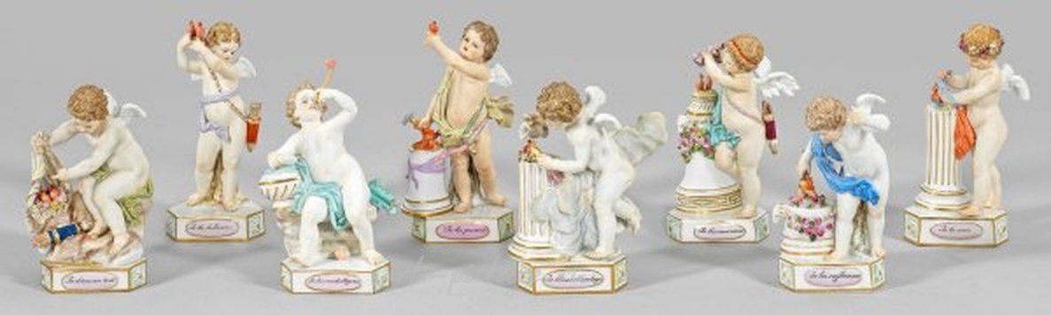 Трехсторонний постамент с розетками, прозванный "Я всё обнаруживаю", "Я их уравновешиваю", "Я делаю их легкими", "Я наказываю их", "Я причиняю им боль и облегчение", "Я короную их", "Я зажигаю их", "Я объединяю их". Полихромная живопись с золотым декором. Возможно, авторство Мишеля Виктора Асьер. Номера модели F 1, F 3 - F 6, F 13, F 14. Частичная реставрация/незначительные повреждения; клеймо перекрещенных мечей. Высота 13,5 см - 14 см. Фигурки детей, занятых сердцами разными способами, были созданы по эскизам Иоганна Элеазара Цайссига, также известного как Шенсау (Шено). (1737-1806). Коллекция из восьми фигурок из фарфора с сердцами из серии "Фигурки детей с устройствами". Частичная реставрация/незначительные сколы. Клеймо перекрещенных мечей. Мейсен. Конец 19 века.