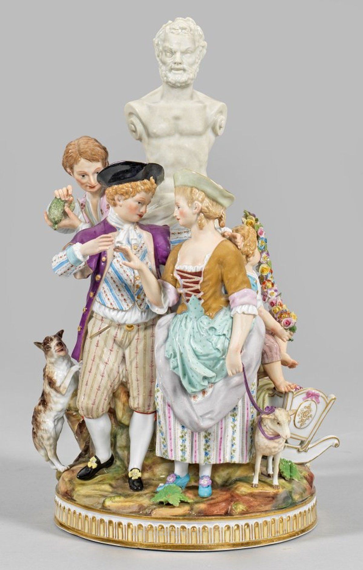 Также называется "Деревенская невеста". На рельефной основе круглой формы находится всеобъемлющая группа. Перед сатировским гермом стоит деревенская свадебная пара, по обеим сторонам которой находятся собака и ягненок. В дальнем плане приближается джентльмен с зеленым кошельком. На оборотной стороне мальчик сидит на камне с гирляндой из пластиковых цветов. У его ног находится наполненная детская колыбель с бельем. Полихромная живопись с позолоченными деталями. Возможно, автором является Мишель Виктор Асье. Частично восстановлено; клеймо в виде меча. Высота: 33 см. См. П. фон Шпее, Классицистическая фарфоровая пластика (Дисс.), Бонн, 2004, кат. № 65. Фарфоровая фигурная группа "Деревенская помолвка". Частично восстановлена. Клеймо в виде скрещенных мечей. Мейсен. Вторая половина 19 века.