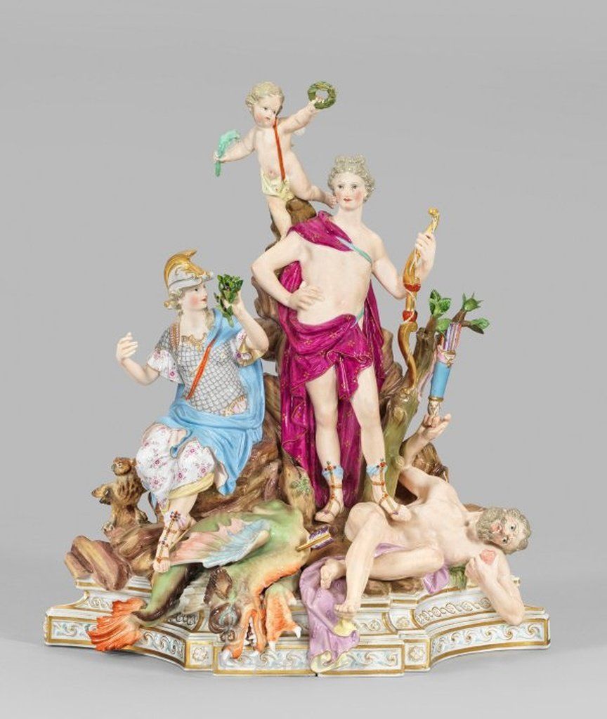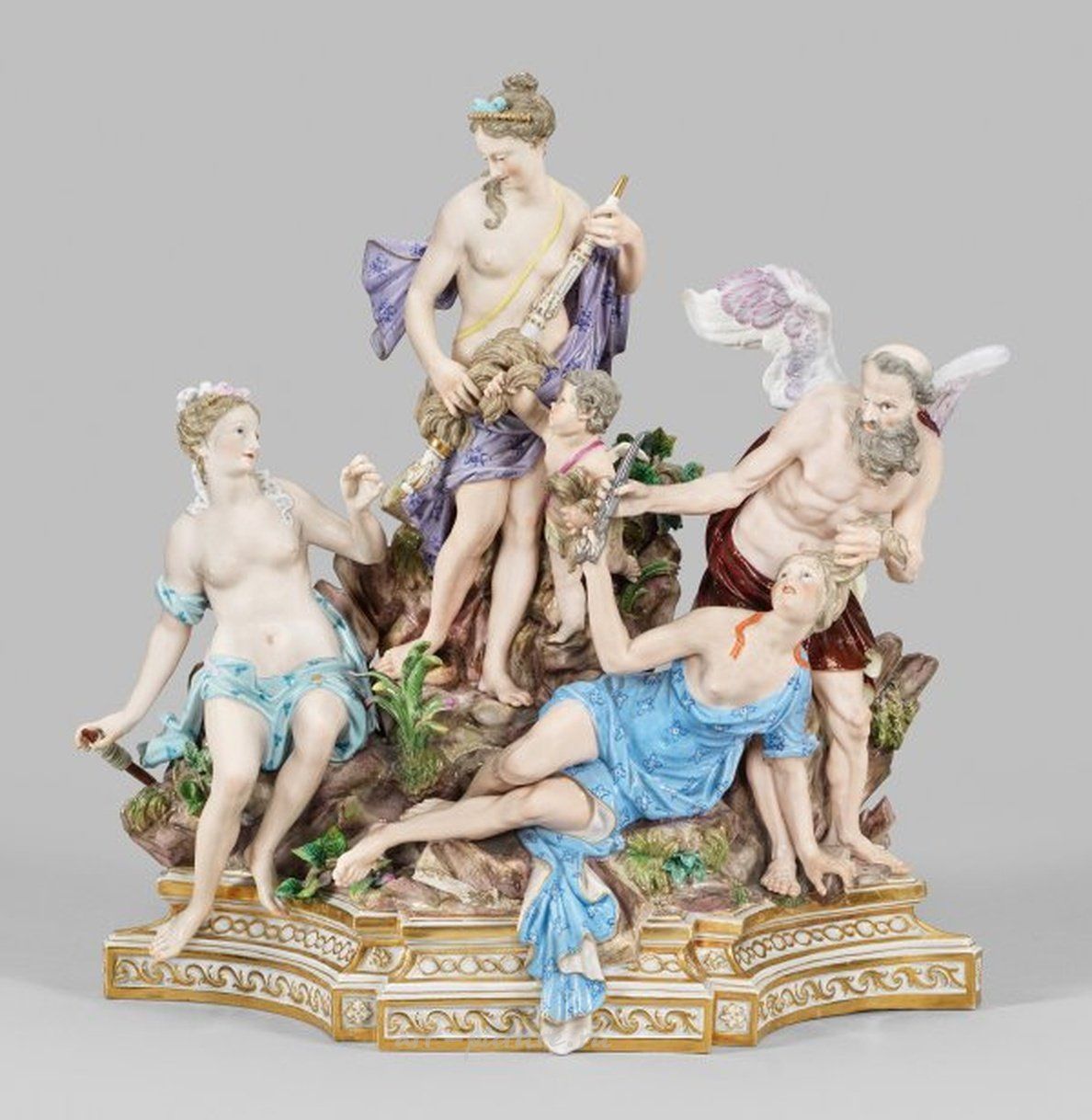 Как парное соединение, две части, винтами связанные друг с другом. Впереди, архитектурно изысканная конструкция с лепной основой, украшенная рельефными орнаментами. Размещенная на скалистом участке, группа из трех римских богинь-парсенни. (богинь судьбы) В центре, на подставке, стоит Клото, возвышенная, сопровождаемая малышом с пучком шерсти. Рядом с ней сидит Лакесис, пряча нити человеческой жизни. Справа стоит Хронос, бог времени, сразу перед ним, лежащая Атропос, удерживающая свои волосы, чтобы не разорвать нить. В качестве антагониста возвышается Аполлон, бог стрельбы из лука, в гордой позе. Его левая рука держит лук, а правая поддерживает бедро. Рядом с ним стоит Минерва, богиня мудрости и войны, с шлемом, броней и копьем. У ее ног сидит сова, символизирующая мудрость. Аполлон стоит на старике, лежащем на земле и представляющем зависть. Рядом с ним полулежит Питон, мифологический дракон, которого, по легенде, Аполлон убивает стрелой. Над группой есть стоящий малыш с венком из лавровых листьев. Полихромная живопись с богатыми золотыми элементами. Возможно, работа Иоганна Йоахима Кендлера, 1774 год. Предположительно прошло частичное восстановление; клеймо в виде меча. Высота 37 см - 38 см. Ширина 34 см - 35 см. Изготовлено по образцам из так называемого "Великого русского ордена" для императрицы России Екатерины II, известной как Екатерина Великая, для отделки Ораниенбаумского дворца. Мастер М.В. Асие создал множество фигурных групп на мифологические темы в честь императрицы Екатерины II и ее политических успехов. См. Питч, Каталог Мейсен для царей, стр. 105 с рис. 29 и № 174; П. фон Шпее, Классическая фарфоровая скульптура, (дисс.), Бонн, 2004 г., кат. № 104 и 105, стр. 304-5. Пара крупных фарфоровых групп "Три Фаты" и "Триумф Аполлона над Питоном" из "Великого русского ордена" для императрицы России Екатерины II, так называемой Екатерины Великой. Две части скреплены винтами. Без значительных восстановлений. Клеймо скрещенных мечей. Мейсен. Вторая половина XIX века.
