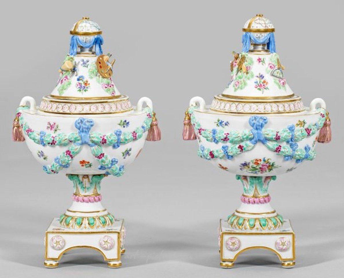 О квадратной постаменте, множественном артикулированном валу и гемисферическом корпусе, боковых кольцах с подвесками. Конусообразная усеченная крышка с короной в форме глобуса, окруженная пластиковым цветочным букетом с различными атрибутами, включая палитру и кисть, угольник и циркуль, резец и деревянный молоток, для живописи и ремесла. Окружены богатыми рельефными декоративными венками из дубовых листьев, розочками и различными орнаментальными границами, а также красочной рассеянной цветочной росписью. Возможно, выполнены Иоганном Иоахимом Кендлером и его сотрудниками. Модель номер Е 85. Незначительный реставрационный процесс; мечи в кресте. Высота 25.5 см. Пара покрытых и орнаментально рельефно декорированных фарфоровых ваз как столовое украшение, расписанных декором "рассеянные цветы". Мейсен, вторая половина 19-го века.