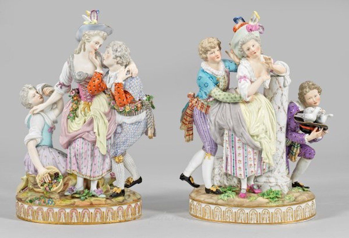 Овал, окруженный рельефным кантусовым листом, представляет собой постамент с полностью пластическим живописным изображением. Кавалер, напоминающий джентльмена, поражает даму в рококо-наряде с перьевой шляпой. Рядом на коленях, сзади мраморной колонны, наблюдающий молодой человек с голубями на чёрной шляпе. В качестве ответной реакции молодая леди обнимает джентльмена. Сидящая, смотрящая вверх девочка с корзиной цветов, вытирающая слёзы. Полихромная живопись с золотыми деталями. Возможно, работа Иоганна Карла Шенхайта. Модель № I 60 и I 49. Некоторые повреждения и частичные трещины. Мечевая маркировка. Высота 29,5 см - 33 см. Пара больших фигурных групп из фарфора, называющихся "Решительный выбор" и "Приближение". Незначительно восстановлены. Маркировка перекрещенных мечей. Мейсен. Вторая половина 19-го века.