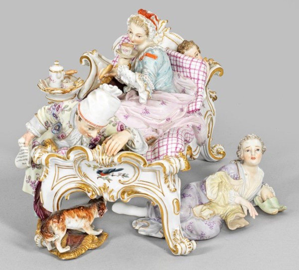 2-частный; Великолепная рококо-кровать с рельефным барочным узором, на которой сидит женщина с чашкой какао и выпечкой, обнаруживающая молодого любовника у ног кровати. Скрытый за клетчатым простынью у ног кровати Амур с луком и стрелами. Полихромная роспись с золотыми деталями. Возможно, авторство Иоганна Юхима Кендлера. Модельный номер D 64. Минимальные повреждения / трещины. Восстановлено. Мечевая маркировка. Высота 5 см - 12 см. Ширина 6 см - 20 см. Длина 12 см - 13 см. См. Питч, каталог "Триумф синих мечей", номер 503. Двухчастная фарфоровая фигурная группа под названием "Обнаруженный любовник". Незначительные сколы / трещины. Восстановлено. Мечи-ножи маркировка. Мейсен. Вторая половина 19 века.