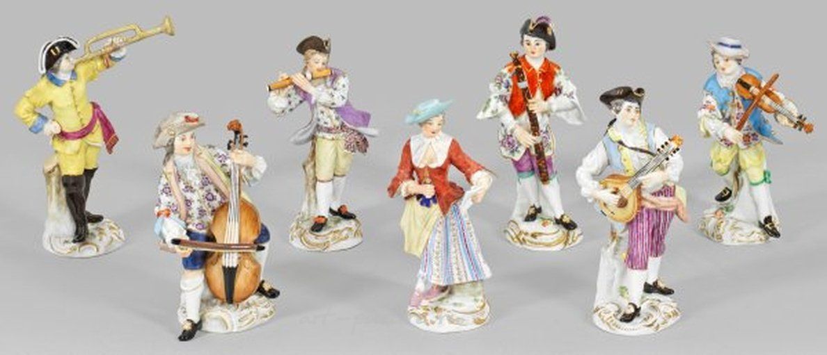 На подстолье в стиле рококо расположены различные музыканты, играющие на лютне, скрипке, флейте и фаготе, а также трубач и сидящий виолончелист, рядом со стоящей женской певицей. Полихромная роспись украшена золотыми акцентами. Возможно, авторство Иоганна Йоахима Каендлера. Модельные номера 60035, 60037, 60040, 2, 3, 4, 12. Частично отреставрированы с незначительными повреждениями. Отмечены перекрещенными мечами. Высота колеблется от 12 см до 14 см. См. каталог Государственной фарфоровой мануфактуры Мейсен, фигуры I. Коллекция из семи фарфоровых фигур из серии "Восхищенный оркестр". На них присутствует маркировка перекрещенных мечей Мейсена. 20-й век.