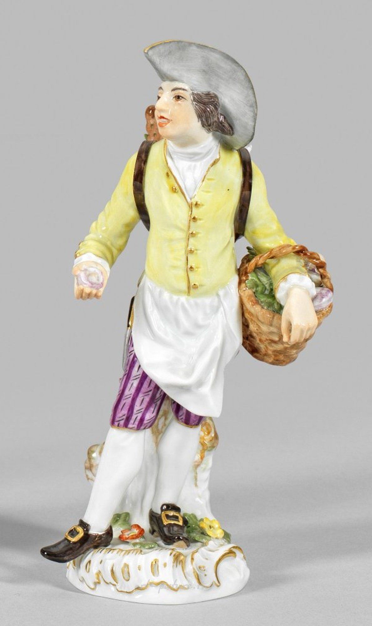 На рокайльно-рельефном пьедестале стоит молодой крикун, несущий на своей спине и в левой руке корзину, наполненную ракушками или устрицами. Полихромная роспись украшена золотыми элементами. Авторы: Й. Й. Кенидр или П. Райнике. Номер модели 60228. Марка меча. Высота 14 см. Фарфоровая фигурка продавца птиц из серии "Кри де Пари". Знак пересеченных мечей. Майссен. После 2000 года.