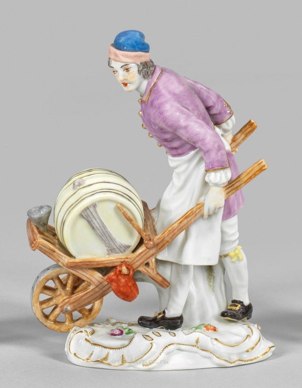 На рельефной основе стоит фигура, толкающая перед собой тачку с уксусной бочкой. Полихромная роспись с золотыми деталями. Авторство J.J. Кендлера или P. Райникке. Номер модели 60252. Марка «Перекрещенные мечи». Высота 13.5 см. Фарфоровая фигурка продавца уксуса из серии "Крис де Пари". Мейсен. После 1973 года.