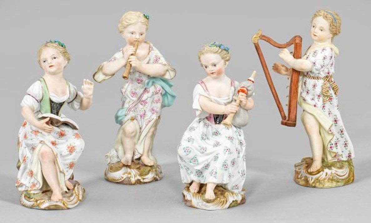 На карельефно-украшенном пьедестале из золота сидят или стоят женщин-певиц, играющих на волынках, кларнетисток и арфисток в цветочных нарядах. Полихромная живопись с золотыми деталями. Созданы Иоганном Иоахимом Кендлером. Модельные номера 2550, 2558, 2566, 2567. Частично с трещинами от обжига/ восстановленные/с небольшими сколами. Клейма в виде мечей. Высота 12,5 см - 14 см. Четыре фарфоровые фигуры из "девичьего оркестра". Клеймо перекрещенных мечей Мейсена. Вторая половина 19-го века.