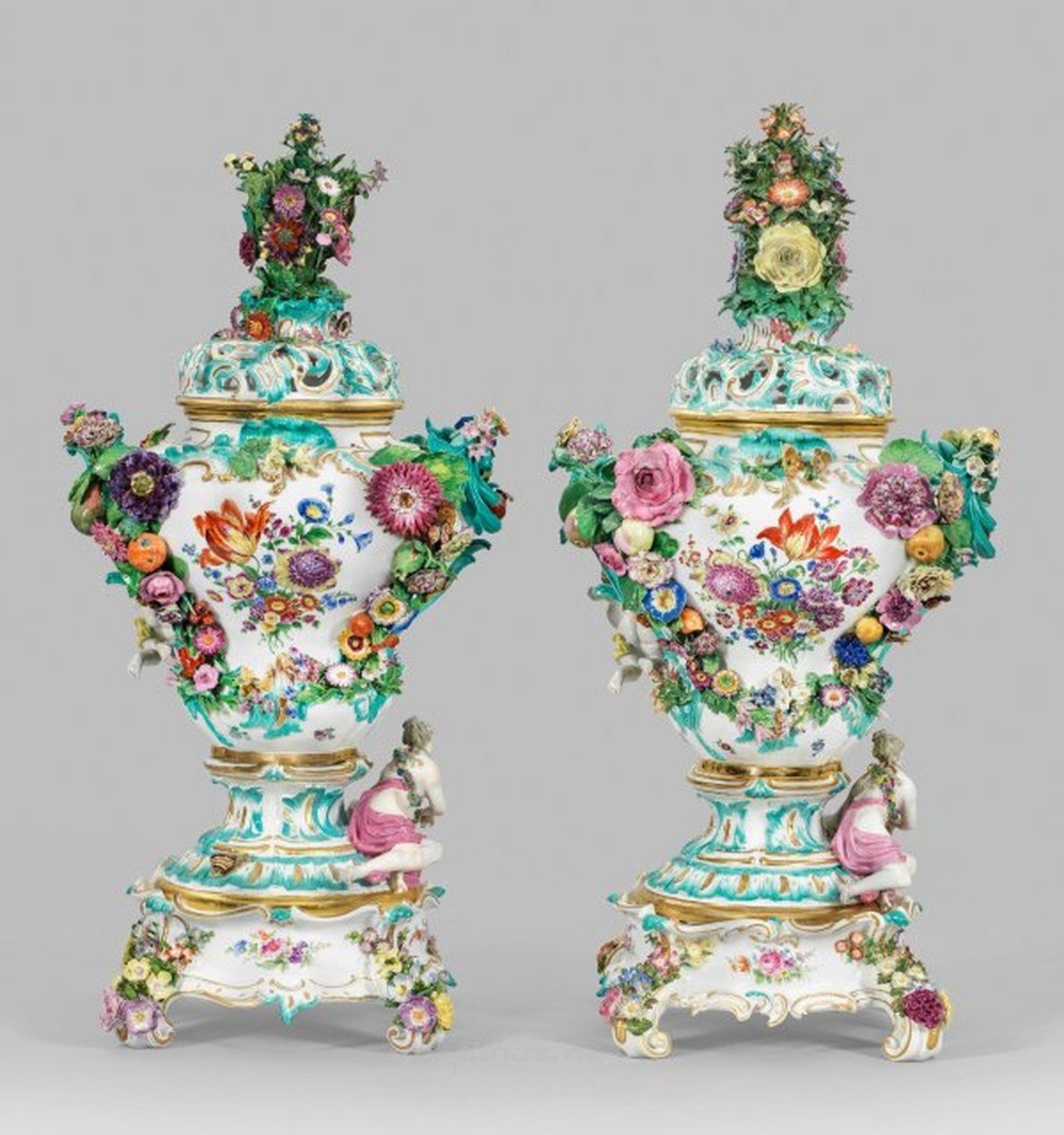 С изображениями Ватто на квадратном пьедестале, поддерживаемом свернутыми волутами, с пластиковым украшением из цветов. Над многоуровневой круглой ножкой находится вазообразное тело с сильным выпуклым объемом. На боках видны рельефные, пластически изображенные ладанки в виде поднимающихся ладанок, изысканная прорезная крышка, увенчанная пластиковым цветочным ароматом. Весь объект украшен рельефным рокайлем. Сверху парящий купидон, снизу сидящая Флора, одетая в цветочное одеяние с полным корзиной цветов. С обеих сторон, в стиле острова, живописное изображение галантных, дворянских фигур Ватто в архитектурных парковых ландшафтах или ярких роскошных цветочных композициях, окруженных пышно нанесенными, тонко моделированными виноградными лозами цветов над рокайльной работой. Полихромная живопись с богатым золотым украшением. Возможно, авторство Иоганна Иоахима Кендлера. Есть незначительные повреждения; восстановлено; клеймо с перекрещенными мечами. Высота вазы 68 см, высота пьедестала 13 см, 31 см × 31 см. Пара великолепных ваз из фарфора для пузырных смесей и соответствующих основ, изящно украшенных цветами, фигурами Флоры и купидона, окрашенными в стиле Ватто, созданными Й. И. Кендлером. Есть незначительные сколы. Восстановлено. Клеймо с перекрещенными мечами. Мейсен. XIX век.