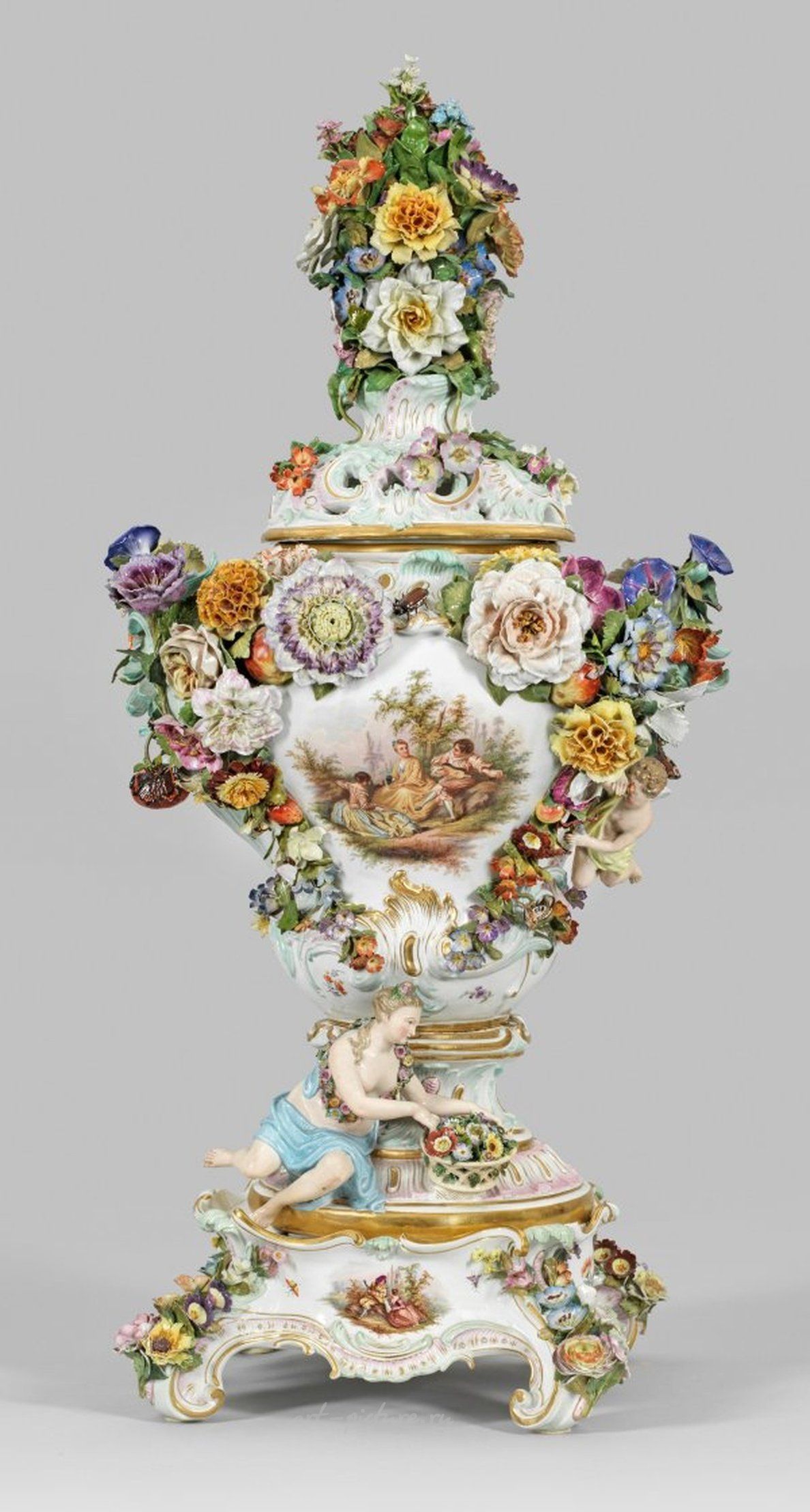 Сцена Ватто и цветочное украшение на квадратной основе, поддерживаемой изогнутыми резными ножками. Выше многоуровневой круглой основы находится баластерообразное корпус вазы с ярко выраженной выпуклостью. Пальмовые листья в виде рельефа восходят на сторонах и служат ручками. Поднятая, пронизанная крышка увенчана изящным цветочным аранжировкой. Все стороны украшены рельефным Рокайлем и разбросанным цветочным украшением, с обильными гирляндами цветов и фруктов, а также иногда насекомыми и бабочками. Внизу сидит Флора с наполненной корзиной цветов, над ней парит купидон. На обеих сторонах стены большомасштабная так называемая сцена Ватто с музыкальным обществом или красочным букетом цветов. Прекрасная ваза с портретом из фарфора с соответствующей основой, тонко нанесенная цветами, фигурами Флоры и купидона, тонко росписанная сцена Ватто и цветочным букетом, смоделированными Дж.Дж. Кендлером. Частично повреждена/восстановлена; маркирована перекрещенными мечами. Высота вазы - 73 см, высота основания - 13 см. Великолепная ваза из портретного фарфора с соответствующей основой, тонко нанесенная цветами, фигурами Флоры и купидоном, тонко расписанная сцена Ватто и цветочный букет, созданный Дж.Дж. Кендлером. Частично обломана/восстановлена. Марка перекрещенных мечей. Мейсен. Вторая половина 19 века.