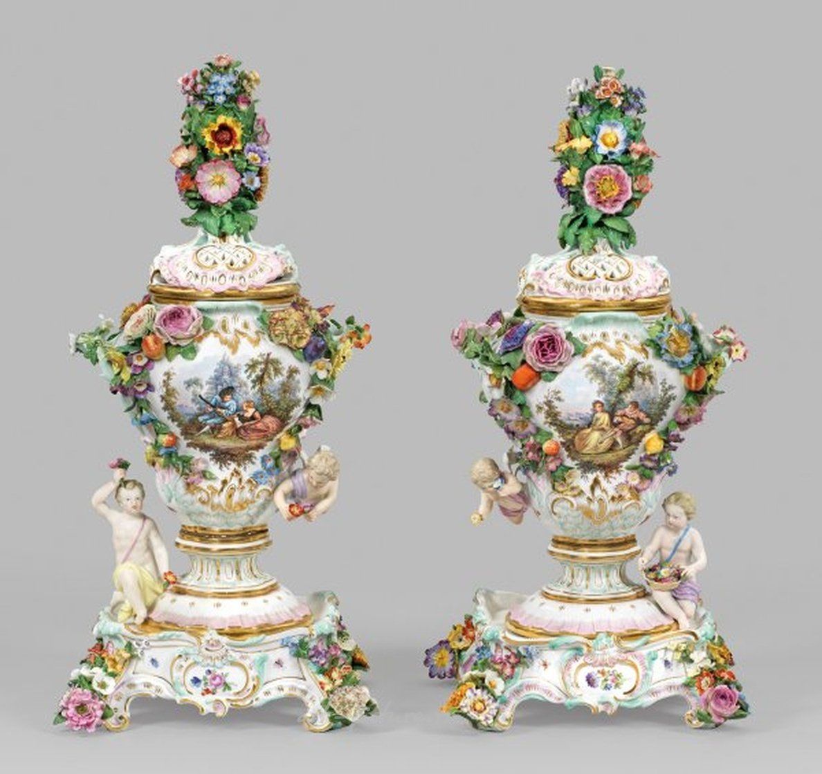 "Великолепные вазы Meissen в стиле "потпурри" с сценами Ватто и цветочными украшениями",