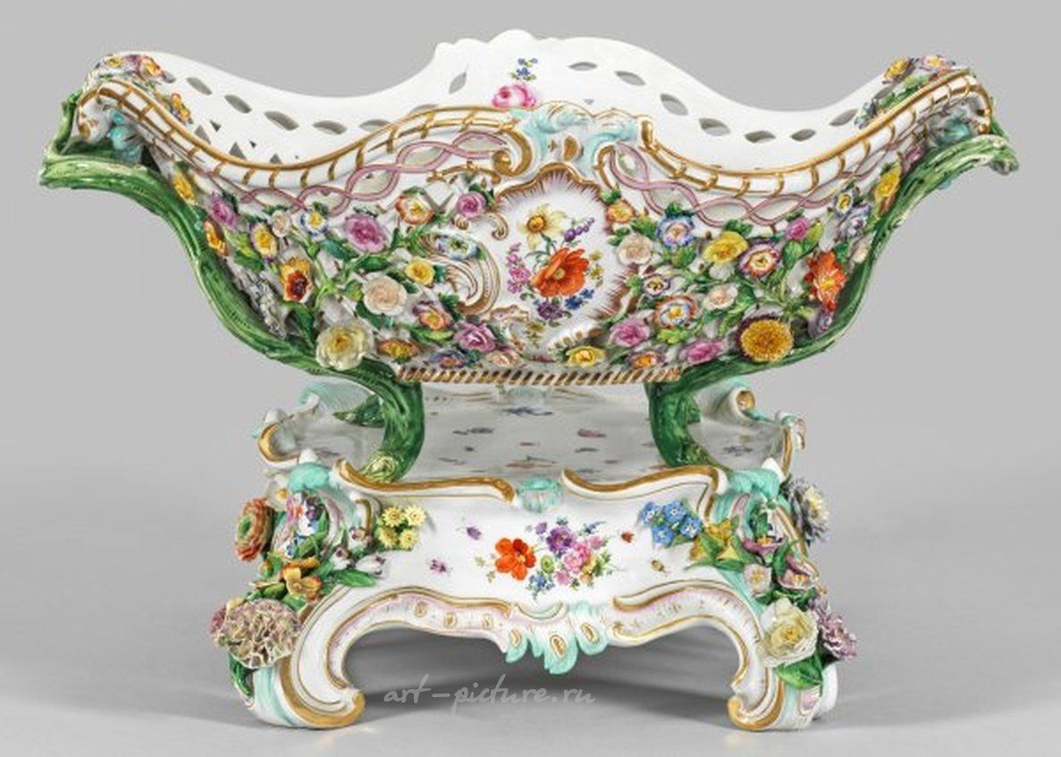 На квадратичной, волютно-поддерживаемой Рокайской основе с флористическим украшением. Изогнутая, глубоко углубленная фруктовая корзина на изогнутых ручках в виде веток, переходящих в ножки. Корзина с отверстами, обита пластиком с цветочными лозами, с резервом в форме Рокай, на обеих сторонах содержащим красочное композицию из цветов и большой букет в зеркале. Полихромное роспись с золотыми акцентами. Состояние: Частично восстановлено; следы от мечей. Высота корзины: 19,5 см, размеры: 51 см х 38 см. Высота основания: 13 см, размеры: 32 см х 32 см. Большой фарфоровый центральный элемент в виде фруктовой корзины на основе с окрашенным и нанесенным цветочным украшением. Есть сколы. Частично восстановлен. Марка перекрещенных мечей. Мейсен. Конец XIX века.