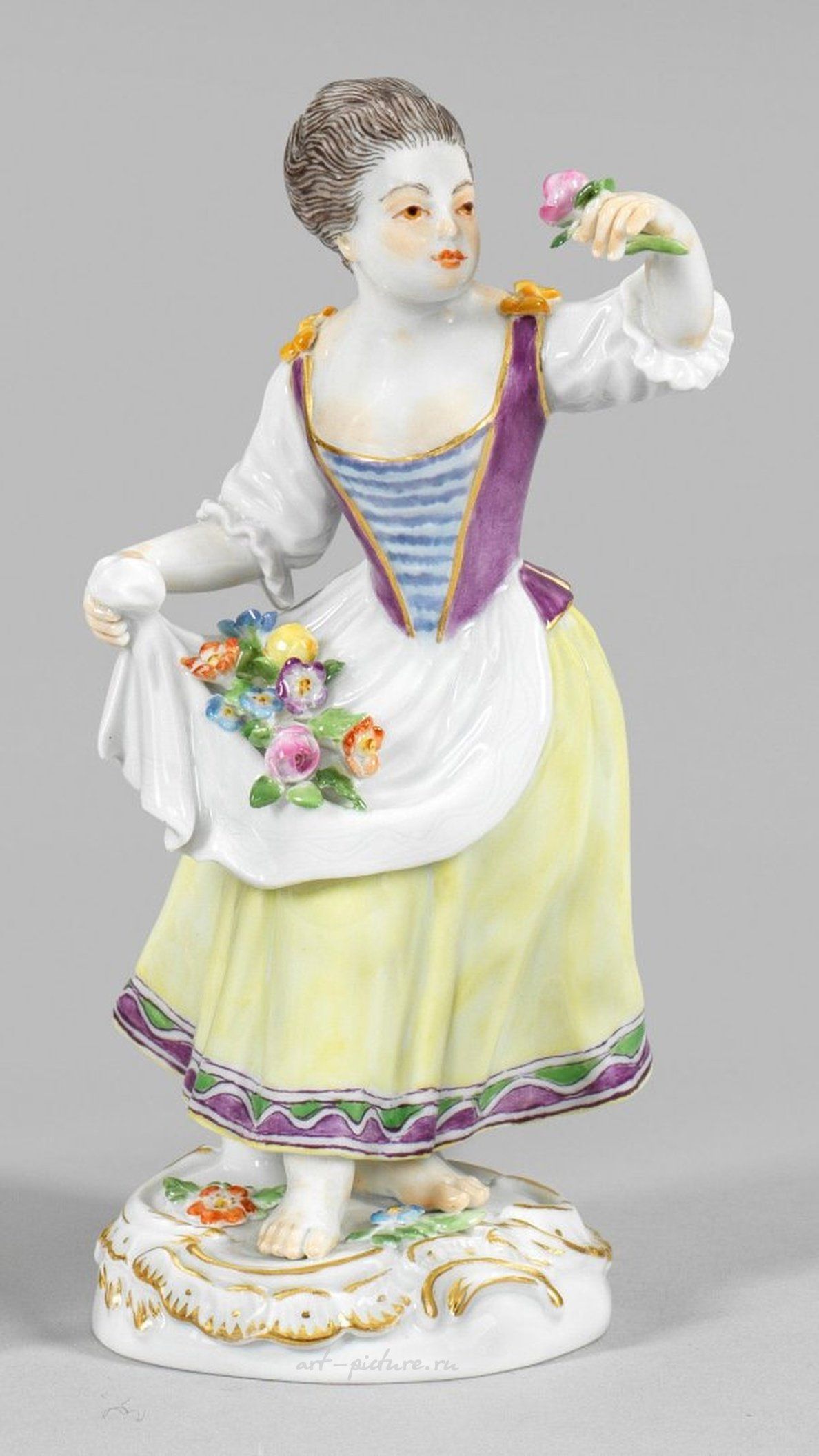 На пьедестале, украшенном рокайлем, стоит девочка с юбкой, наполненной цветами. В её поднятой левой руке она держит розу. Полихромная роспись с золотыми вставками. Возможно, авторство Йохана Йоахима Кендлера. Номер модели 60317. Мечевая марка. Высота 13 см. Фарфоровая фигурка девочки-садовника с цветами. Крестообразная марка мечей. Майссен. После 2000 года.