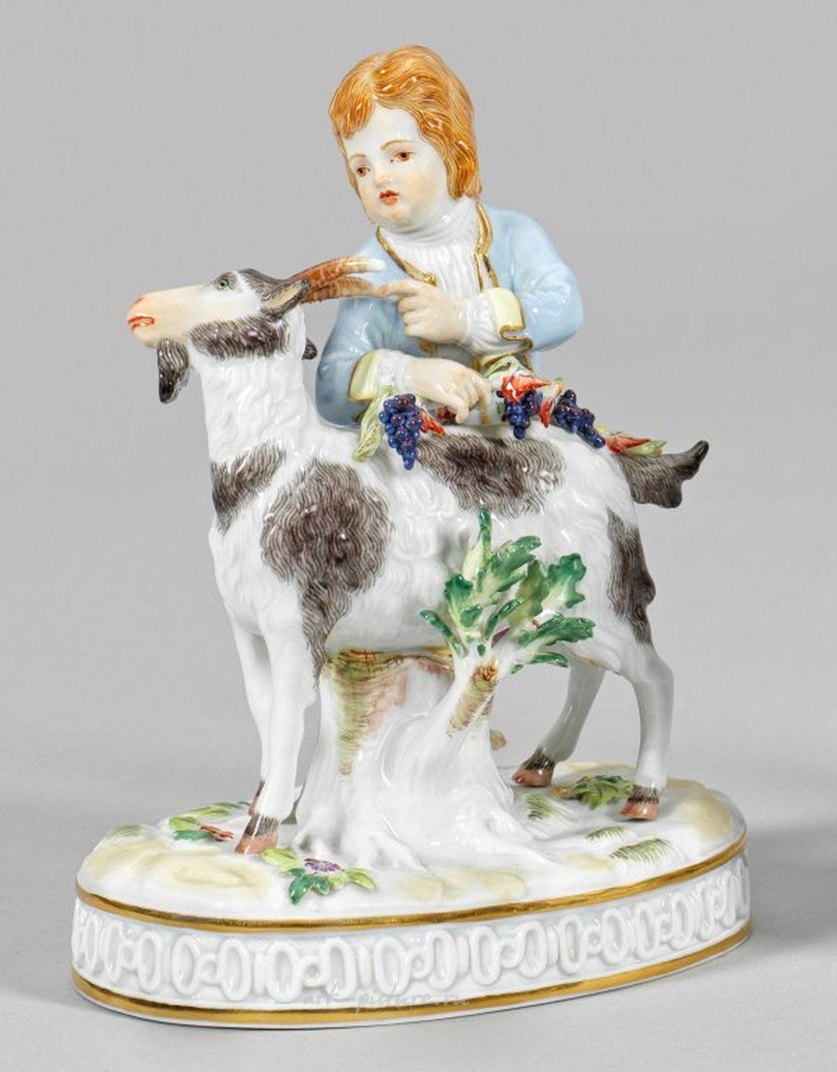 На рельефной овальной основе с изящными украшениями стоит мальчик, украшающий козлика гирляндой из виноградных лоз. Многокрасочная роспись украшена золотыми акцентами. Возможно, выполнено Иоганном Карлом Шонгайтом. Номер модели 61270. Маркировано мечом. Высота 14,5 см. Фарфоровая фигурка мальчика с козликом. Марка скрещенных мечей. Мейсен. После 1973 года.