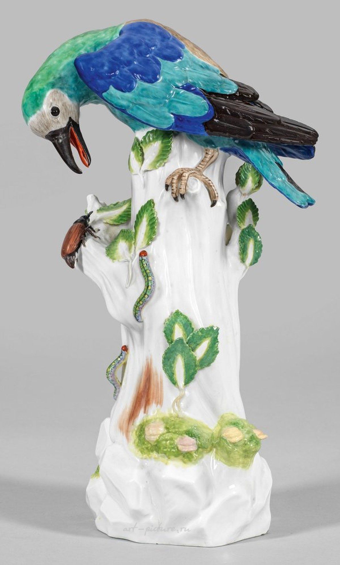 На скалистом пьедестале, сидя на высокой, прочной пеньке с веником из листьев сверху, находится европейский колоколенок. У птицы красочное оперение с рельефными перьями, голова наклонена вниз, а крылья сложены. Возможно, артистом этой работы является Иоганн Иоахим Кондлер. Модельный номер 953x. Восстановленный. Мечи перекрещенные. Высота 37 см. В королевском зоопарке Иоганн Иоахим Кондлер смог подробно изучить мир птиц. Он эксклюзивно создал серию фарфоровых птиц для Японского дворца Августа Сильного. См. Рюккер, каталог Баварского национального музея, фигура 1108; Рёббиг, Кабинетные произведения, номер 30, страница 152. Большая фарфоровая фигура европейского колоколенка. Восстановленная. Мечи перекрещенные. Мейсен. Конец 19 века.