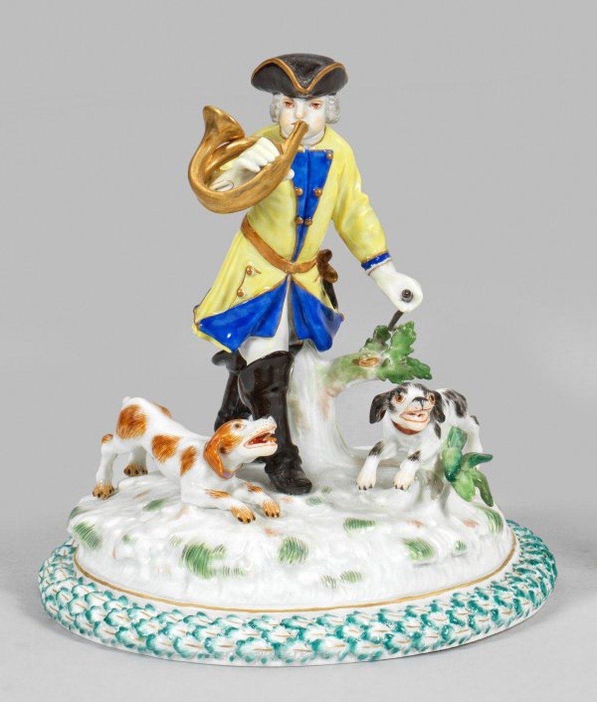 На круглой основе местностной формы, окруженной границей из пластикового листья дуба, стоит охотник с золотым охотничьим рожком, сопровождаемый двумя собаками. Полихромная живопись украшена золотыми акцентами. Возможно, авторство Иоганна Фридриха Эберлайна. Модельный номер 63002. Незначительное восстановление; отметка в виде перекрещенных мечей. Высота 15,5 см. См. каталог "Staatliche Porzellan-Manufaktur Meissen, Фигуры II, Лист 7, No. 217". Группа фарфоровых фигур, изображающая охотника с рогом и собаками. Незначительное восстановление. Отметка в виде перекрещенных мечей. Мейсен. После 1973 года.