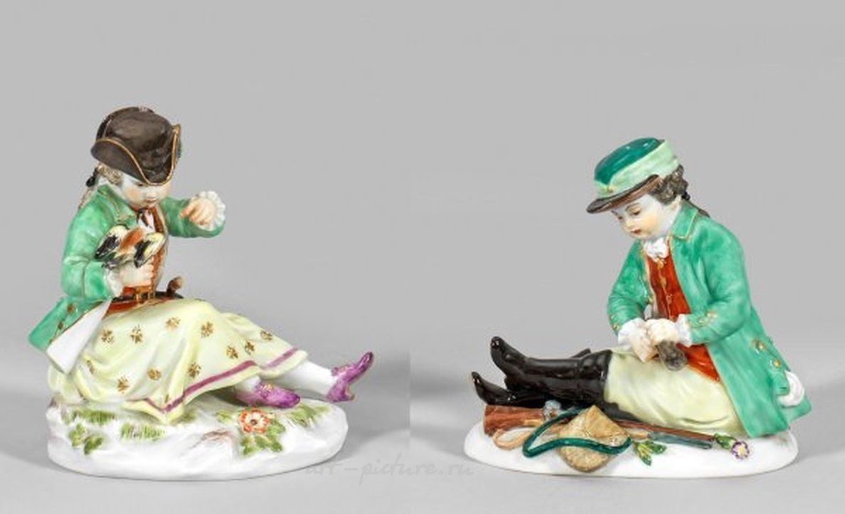 На овальном основании, украшенном пластиковыми цветами и листьями, сидит маленький охотник-мальчик, держащий в руках порошковую фляжку. Рядом с ним находятся винтовка и сумка для охоты. В качестве контраста рядом сидит девочка-охотница, держащая птицу на правой руке. Полихромная роспись изящно украшена золотыми акцентами. Модельные номера B 29 и B 30. Мечевая марка. Высота 9 см - 10 см. Пара фарфоровых охотничьих детей. Мейссен. Примерно 1924-1934 годы.