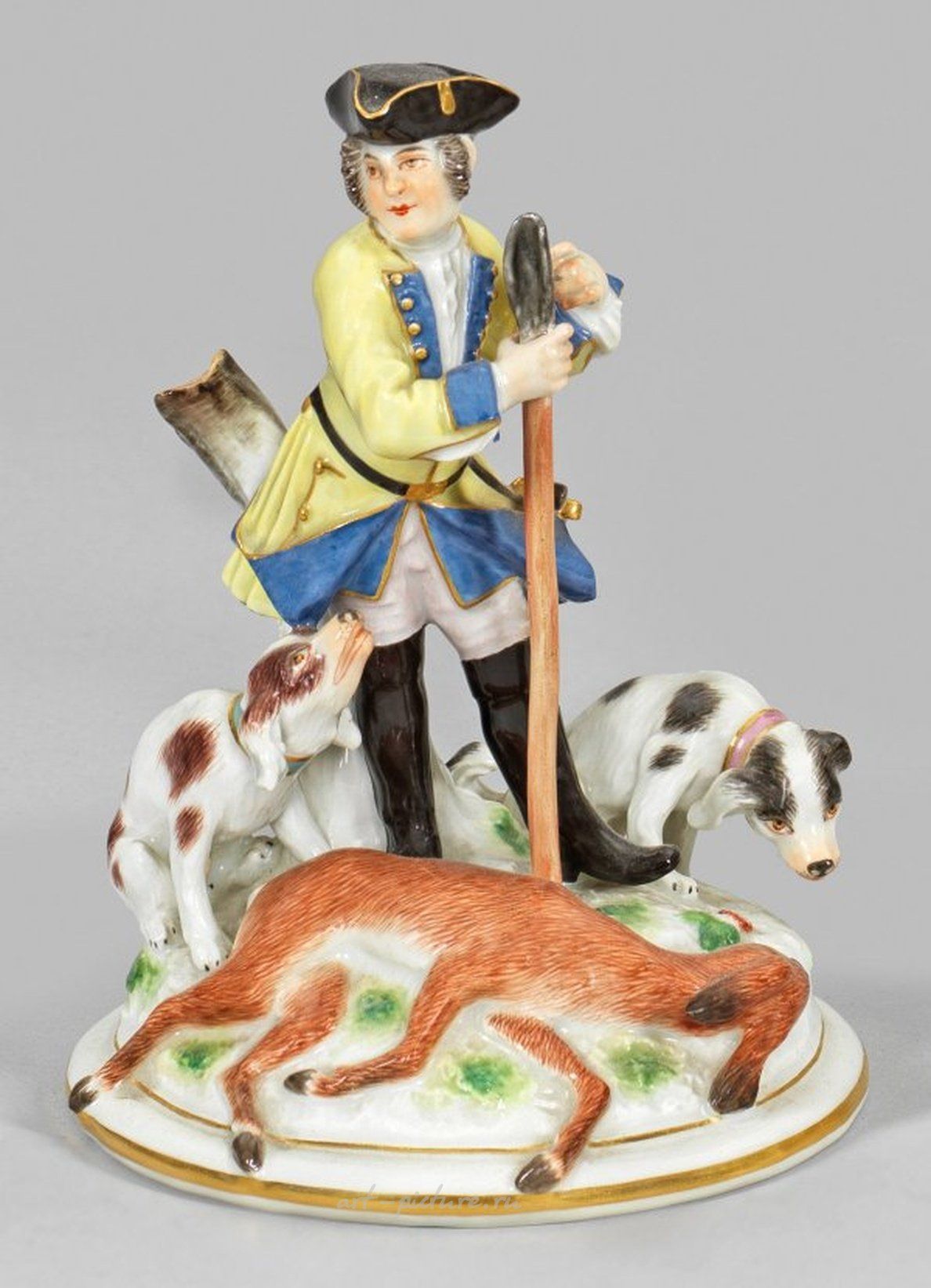 На изогнутом пьедестале стоит охотник в желтом охотничьем пальто с синими акцентами, украшенный треуголкой, окруженный двумя собаками, держащий копье в правой руке. У его ног лежит охотимая оленя. Эта полихромная картина с золотыми деталями приписывается Йохану Готлибу Эдеру, модельный номер 223. Она имеет минимальное восстановление и имеет марку в виде перекрещенных мечей. Ее высота составляет 15 см. Пожалуйста, обратитесь к каталогу Государственной фарфоровой мануфактуры Мейсен, Фигуры II, страница 7, номер 223. Этот фарфоровый фигурный группу изображает охотника с убитым косулей. У него есть незначительное восстановление и отмечен перекрещенными мечами. Изготовлено в Мейсене примерно в период с 1935 по 1945 год.