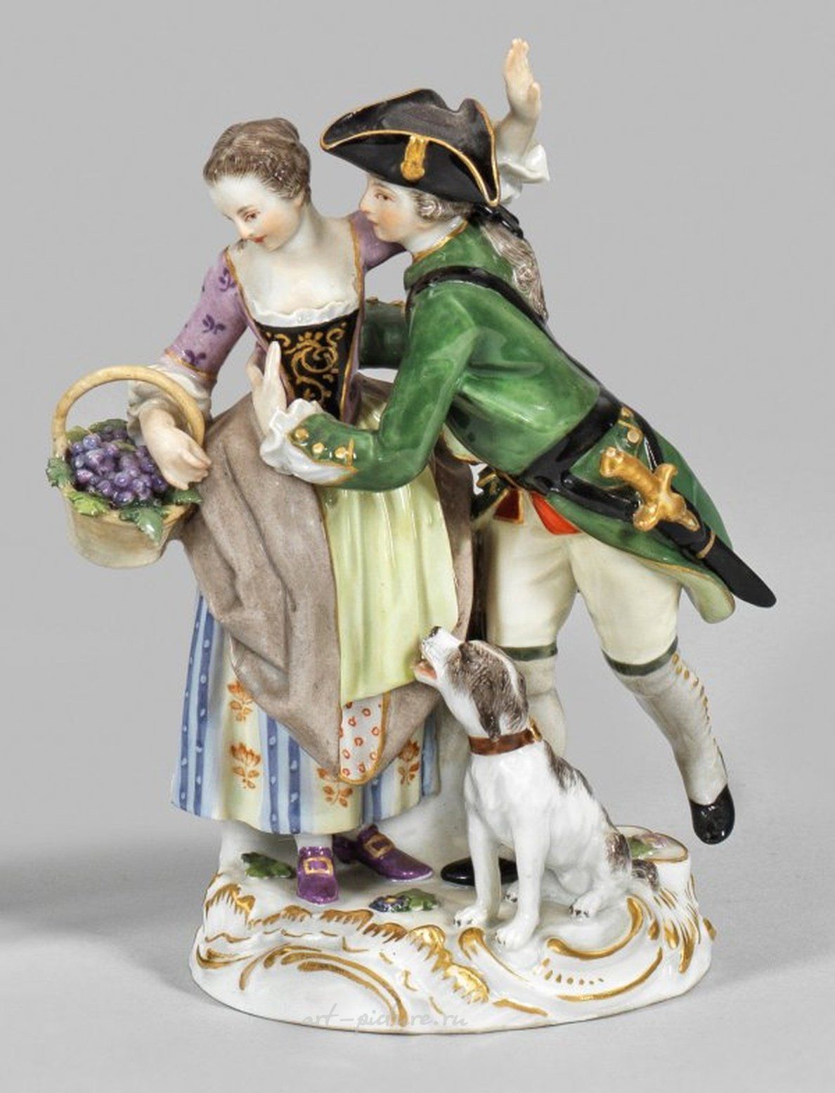 На арочной пьедестале в стиле рокайль стоит сидящая галантная пара. Молодой охотник с охотничьей собакой пытается обнять девушку с виноградной корзиной. Полихромная живопись с золочеными деталями. Вероятно, авторство Иоганна Иоахима Кендлера. Номер модели 38. Минимально повреждено/восстановлено. Мечевая марка. Высота 15 см. Фарфоровая группа галантной пары, являющаяся аллегорией осени. Есть незначительные сколы/восстановления. Мечевая марка с перекрещенными мечами. Мейсен. Конец XIX века.
