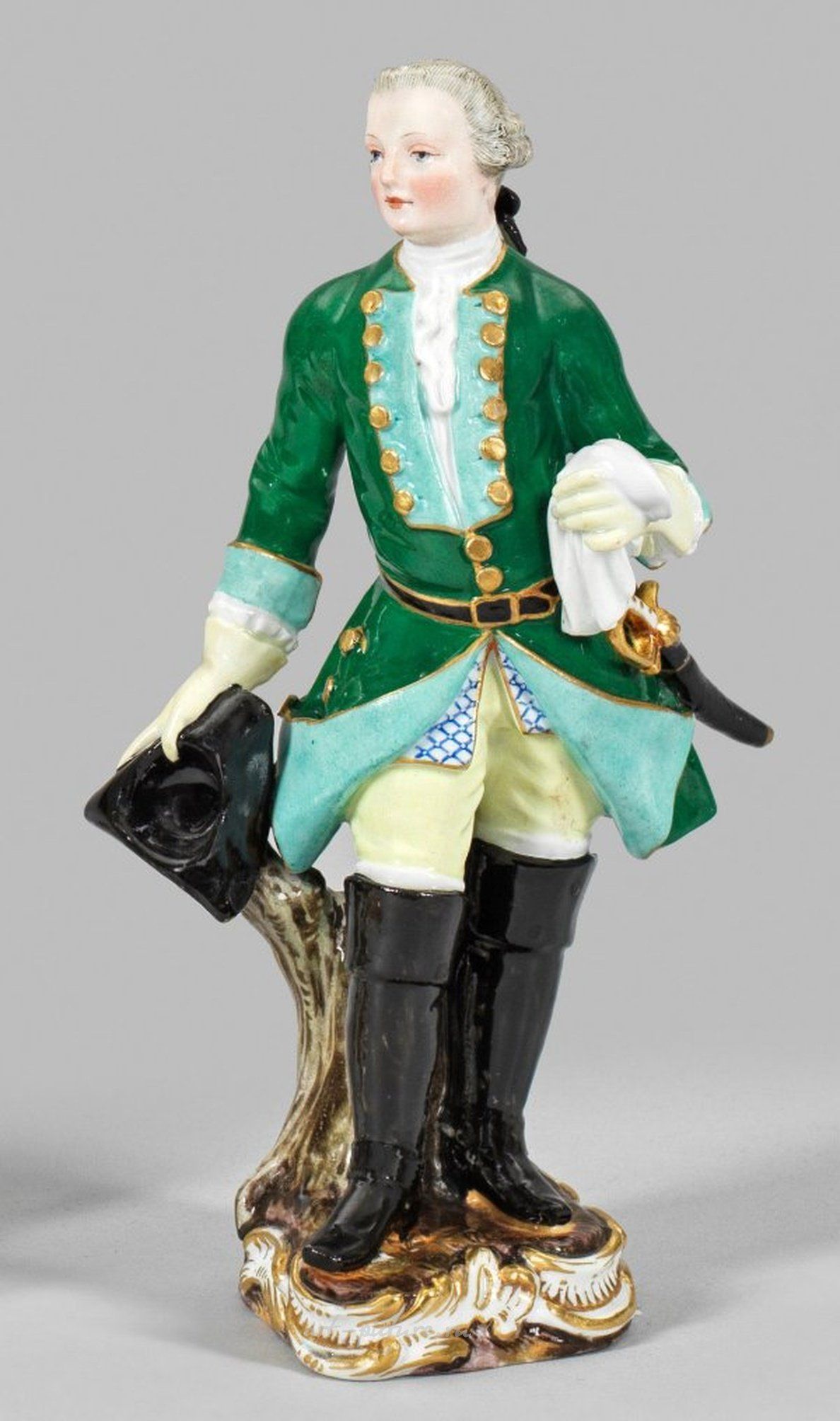 На рокайльной подставке стоит соколничий в платье елово-зеленого цвета, держащий трезубец или тряпку в руках. Полихромная роспись украшена золотыми деталями. Возможно, автором является Иоганн Фридрих Эберлайн. Номер модели 512. Реставрировано. Мечевая марка. Высота 18 см. Фарфоровая фигурка соколничего. Мейсен. Конец 19 века.