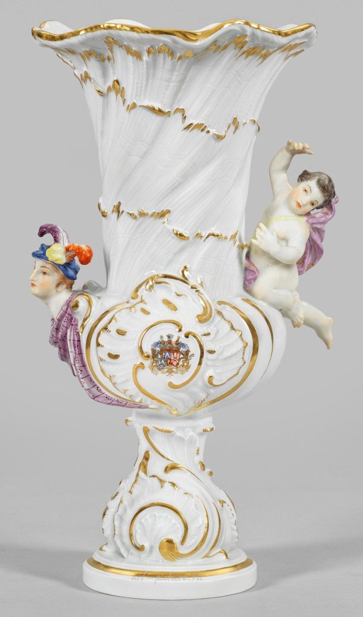 Восходя над профильной округлой основой, балюстровидный ствол переходит в выпуклое тело и ступенчато расширяющуюся коническую шейку с качающимся ободом. Боковые ручки имеют форму мужской головы с перьяной шляпой или полностью пластических ангелочков, одетых в лиловую ткань с золотистыми витиеватыми узорами. Сосуд украшен рельефными скульптурами по бокам ракушечной ракушки и рокайскими украшениями из «Сванской службы» (дизайн лебедя). С обеих сторон стены, в рамке с золотистым контуром, находятся гербы Генриха Граффа фон Брюля и его жены Франциски фон Коловарат-Краковской или ветвь хризантемы в стиле Какимон. Полихромное роспись украшена золотым декором. Модельный номер 50315. Мечевая марка. Высота: 30 см. Великолепный фарфоровый ваза с декором из «Сванской службы». Помечено перекрестными мечами. Мейсен. После 2000 года.