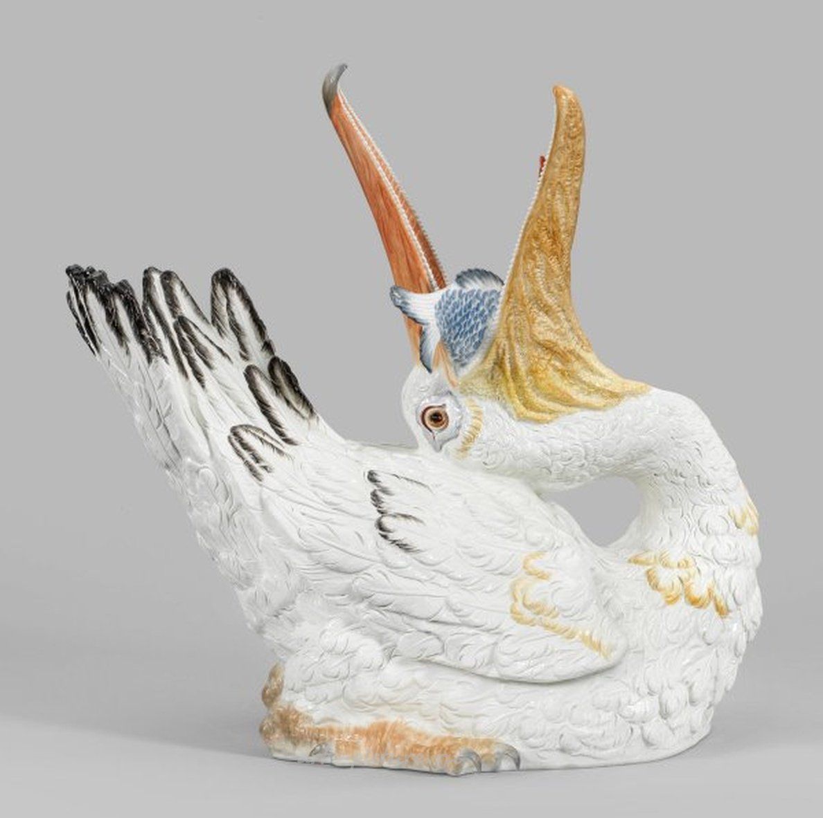 Сидящий пеликан с изогнутой, длинной шеей и поднятой головой, держащий карпа в широко открытом клюве. Скульптура исключительно реалистична, с детализированным моделированием перьев, когтей, клюва, гортанного мешка, хвоста и чешуи рыбы. Возможно, работа Иоганна Иоахима Кендлера, 1732 год. Акцентированная, полихромная роспись. Мечевая марка. Мейсен. Примерно 1924-1934 годы. Высота: 75 см. Ширина: 76 см. Глубина: 44 см. Выразительный и мастерски выполненный пеликан, с широко открытыми глазами в момент поглощения рыбы. Индицированные волны указывают на то, что художественная концепция представляла собой плавание пеликана в воде. Иоганн Иоахим Кендлер (1706-1775) создал множество скульптур животных натуральную величину в начале 1730-х годов по заказу Августа Сильного для его королевской коллекции в Японском дворце, где они предназначались для выставки в представительных целях. Для этой цели Кендлер изучал каждую деталь местных и экзотических животных, содержащихся в дворцовых зверинцах, включая их внешний вид, текстуру перьев или меха, клюв или рот, а также характерные позы и выражение. До 1735 года было доставлено шесть экземпляров скульптуры пеликана, известной как "большая ложная гусь" Кендлера. Оригинальная модель из 18 века находится в Государственной художественной коллекции Дрездена (инв. No. PE 205). См. Пицш, Скульптура из фарфора Мейсен, No. 221; Спонсель, Кабинетные предметы из фарфора Мейсен, стр. 96-97. Исключительная скульптура пеликана натурального размера из литого порцелана, изготовленная по модели И.И. Кендлера, изначально предназначенная для королевской коллекции Августа Сильного в Японском дворце. Марка "Скинутые мечи". Мейсен. Примерно 1924-1934 годы.