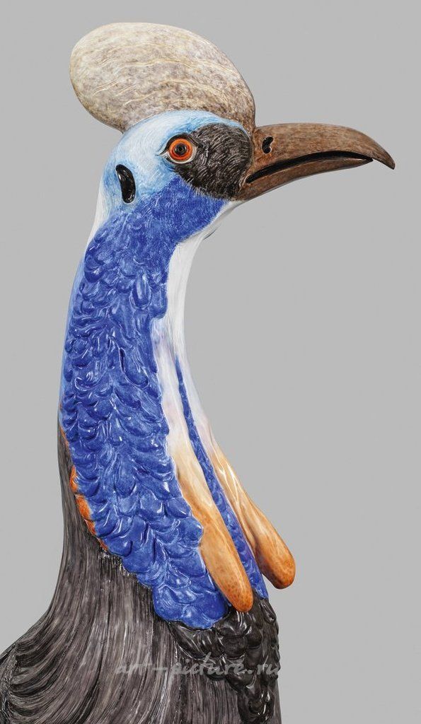 Полностью вылепленная, величественно изящная фигура кассуара, стоящего на украшенном скульптурными ветвями пни дерева, с непоколебимо прямой шеей и поднятой головой, увенчанной круглым гребнем. Острый, сужающийся, изогнутый клюв немного раскрыт. Сильнорельефные перья и ярко выделенная раскраска, которая напоминает красочный оперение касуаров, встречающихся в природе. Полихромная роспись. Возможно, выполнено Йоханом Йоахимом Кендлером в 1732 году. Маркировано перекрещенными мечами. Высота 128 см. Великолепный образец, выполненный на основе натуралистической модели. Август Сильный проявлял выраженный интерес к зоологии. Он содержал зверинцы, финансировал экспедиции в Африку и приобретал различные образцы птиц для своей Кунсткамеры. Он заказал серию крупных животных скульптур для Королевской коллекции в Японском дворце в Дрездене в 1730-х годах. Йохан Йоахим Кендлер изучал и рисовал так называемых экзотических животных в зверинце. В традиции Кирхнера Кендлер детально моделировал характерное положение и выражение животных, не только их внешний вид. Попытка изобразить животных натурального размера из фарфора была успешно реализована, в том числе и модели птиц. Однако это ставило перед ними значительную техническую задачу в 18 веке. В отчете инспектора по производству Рейнхарда Кендлер сделал "птицу кассуар, натурального размера (...)" . В списке инвентаря от 1770 и 1779 годов указаны четыре версии этой модели. См. Рюккер, Cat. Bayer. Nationalmuseum, с. 189 и далее; Питч, Cat. Meissen Porcelain Sculpture, No. 222; Спонсель, Cabinet Pieces of Meissen Porcelain, с. 96; Альбикер, No. 25; Государственные художественные собрания Дрездена, Инв. № PE 188. Исключительная фарфоровая фигура кассуара, моделированная в натуралистическом стиле в натуральную величину Й.Й. Кендлером, изначально созданная для Королевской Коллекции Августа Сильного в Японском дворце. Маркировано перекрещенными мечами. Мейсен. Около 1924-1934 года.