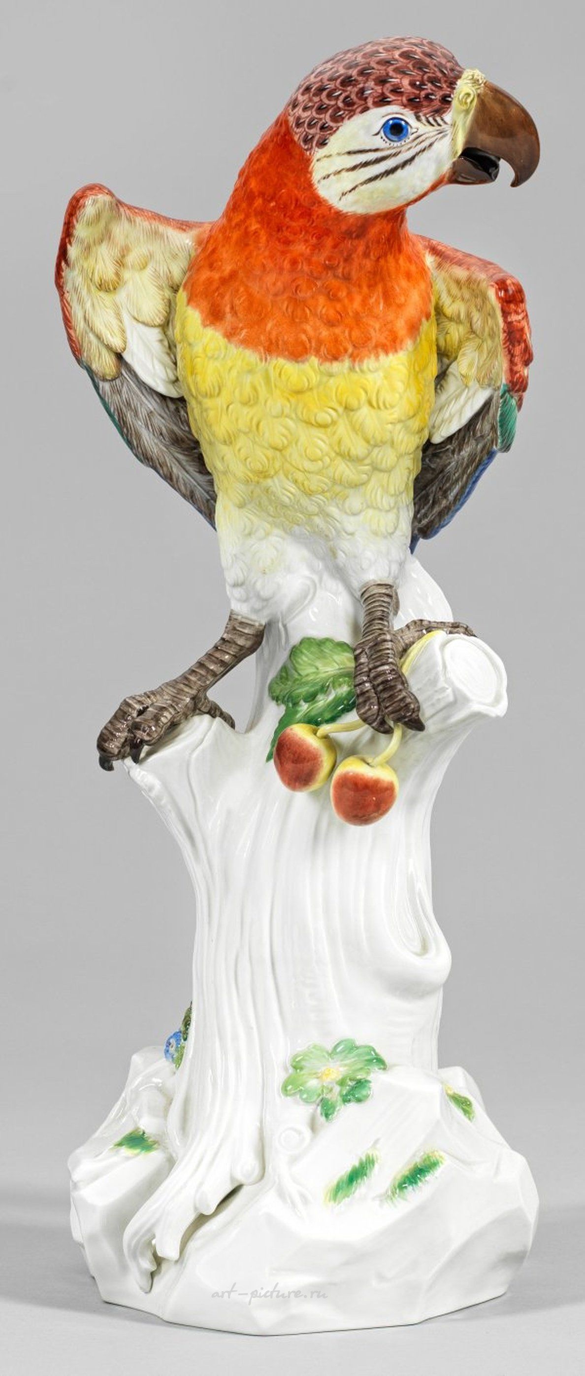 Восходя на прочной каменной основе, ствол дерева украшен веткой с плодами вишни, цветами и листьями. На вершине сидит попугай с ярким перьевым нарядом в красных и желтых тонах с зелено-голубыми акцентами. Голова с чешуйчатыми перьями повернута влево. Полихромная роспись. Возможно, работа Иоганна Иоахима Кендлера. Номер модели 77234. Восстановлено. Мечи. Высота 43 см. См. каталог Государственной фарфоровой мануфактуры Мейссен, Цветные птицы, A43a. Большая фарфоровая фигурка попугая на стволе, выполненная Й.Й. Кендлером. Восстановлено. Мечи. Мейссен. После 1973 года.
