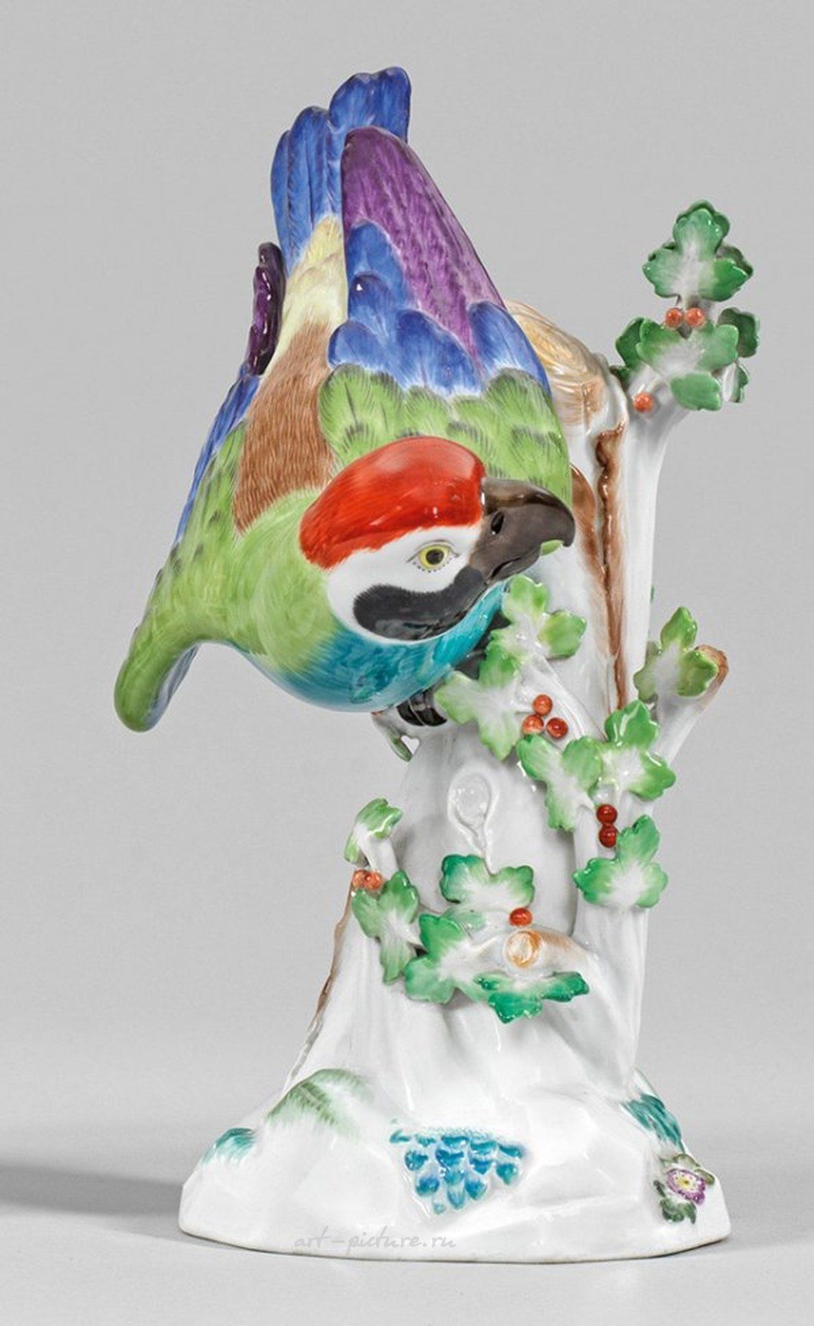 На прочной ветке дуба с пластиковыми листьями сидит попугай. Освобожденное, ярко украшенное оперение выполнено в полихромной живописи. Возможно, это работа Иоганна Иоахима Кандлера. Номер модели 46. Мечевая марка. Высота 22 см. Фарфоровая фигурка попугая на стволе. Крестовая мечевая марка. Майсен. Приблизительно 1935-1945 гг.