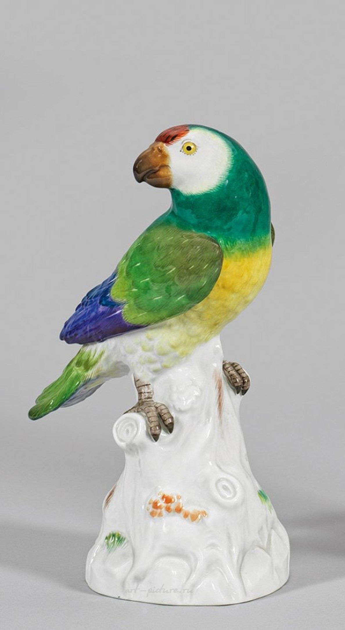 На основании голова повернута вправо. Выделяется рельефом, богато окрашена в различные оттенки зеленого цвета, украшена акцентами синих и красных перьев. Колоритная роспись. Возможно, выполнена иоганн-йоахимом Кэндлером. Номер модели 59. Мечевая маркировка. Высота 23 см. Сравните с каталогом Государственной фарфоровой фабрики Мейсен, "Колоритные птицы", 59x. Фарфоровая фигура попугая на стволе. Крестовая маркировка. Мейсен. Около 1935-1945 гг.