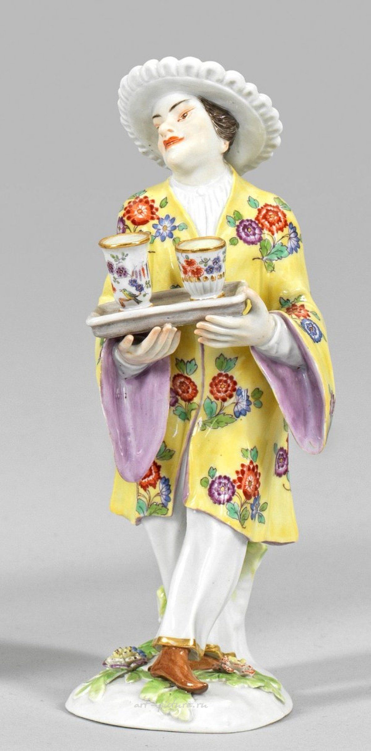 На пьедестале, украшенном пластиковыми цветами и листьями, стоит японская фигура в желтой одежде с индийским узором из цветов, держащая планшет с двумя чашками. Полихромная живопись украшена золотом. Возможно, авторство Петера Райникке. Модельный номер 437. Минимальные повреждения. Мечовая марка. Высота 16 см. Фарфоровая фигура японца с пиалой. Есть небольшие сколы. Крестовая марка с мечами. Майссен. Конец XIX века.