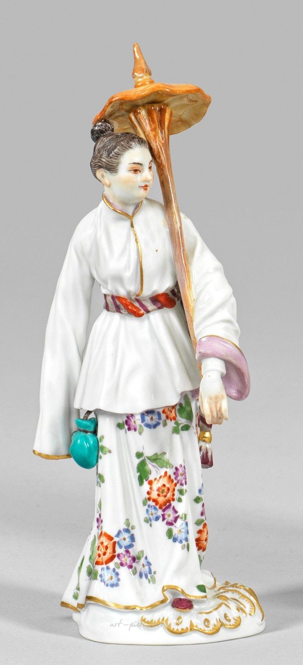 На пьедестале в стиле рокайль стоит японская женщина в белом кимоно с подшивкой, украшенной народными американскими цветочными узорами, удерживающей зонтик в левой руке. Полихромная роспись украшена золотыми акцентами. Изготовлено либо Йоханом Йоахимом Кендлером, либо создано по образцу его работ под номером модели 65645. Восстановлено, отмечено перекрещивающимися мечами. Высота: 18 см. Фарфоровая фигура японской женщины с зонтиком. Восстановлено. Отметка перекрещенных мечей. Мейсен. После 1973 года.